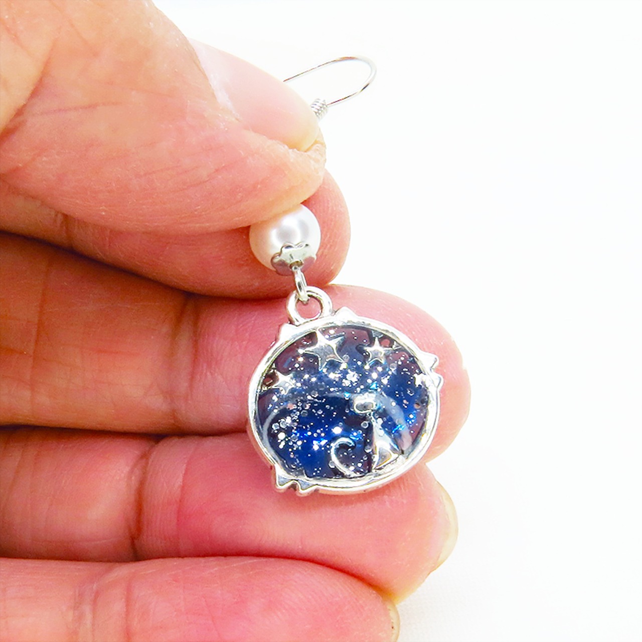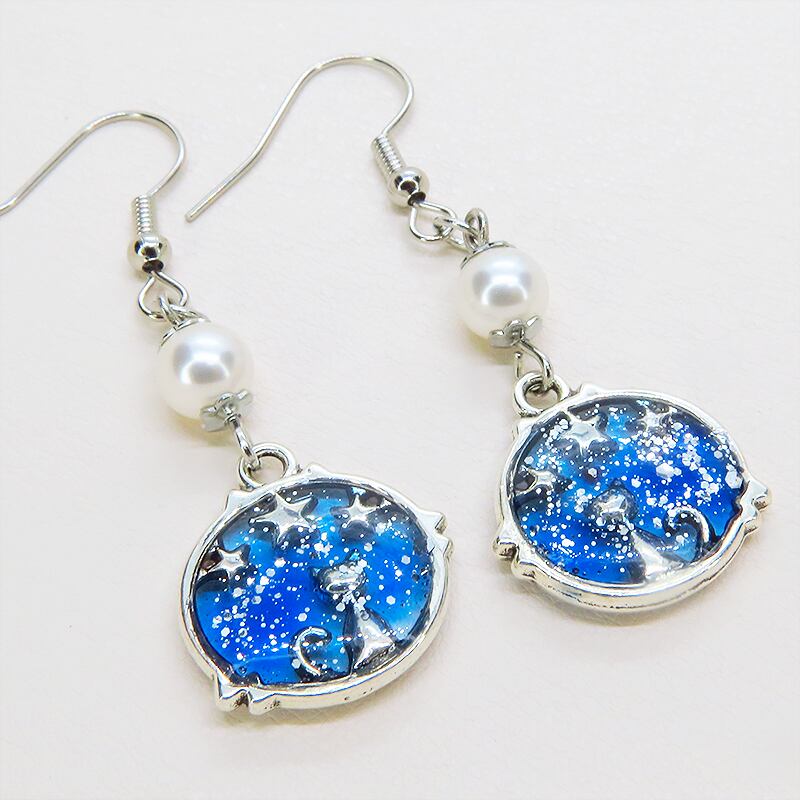 シルバーカラーの猫シルエットと星のチャームにマリンブルーのレジンで彩られた夜空が美しいピアスです