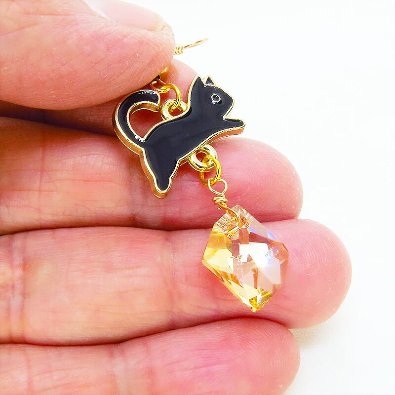 黒猫のシックな色合いとクリスタルの温かみのあるゴールドの輝きが絶妙なバランスで調和して、大人っぽくも可愛らしい魅力的な耳元を演出します