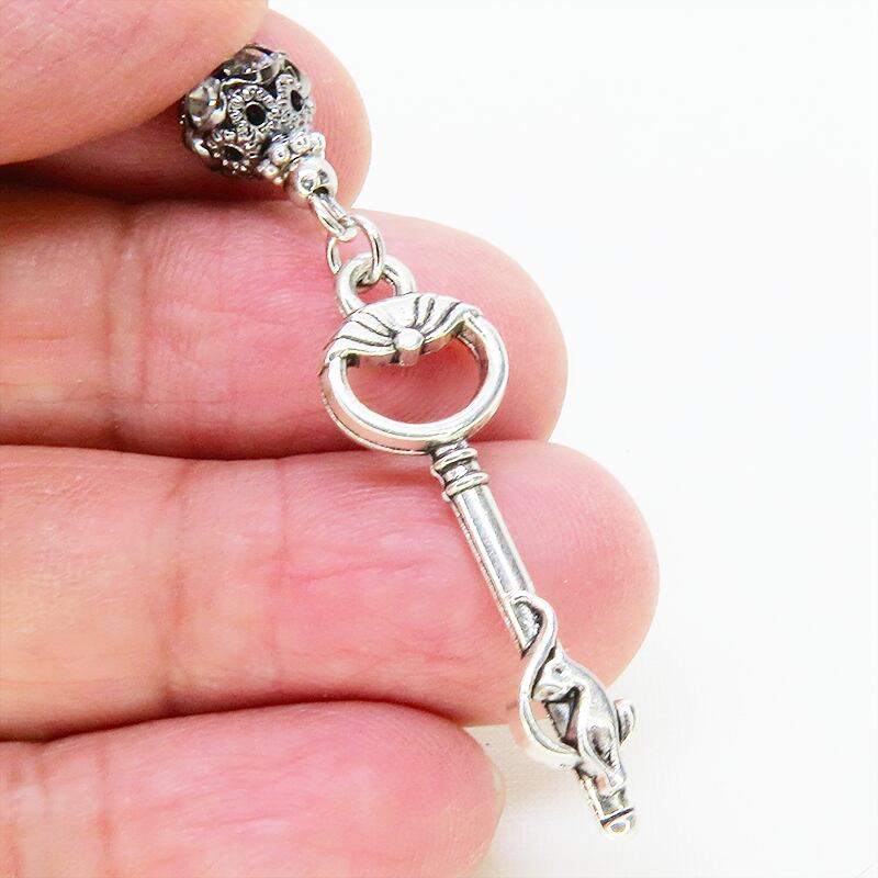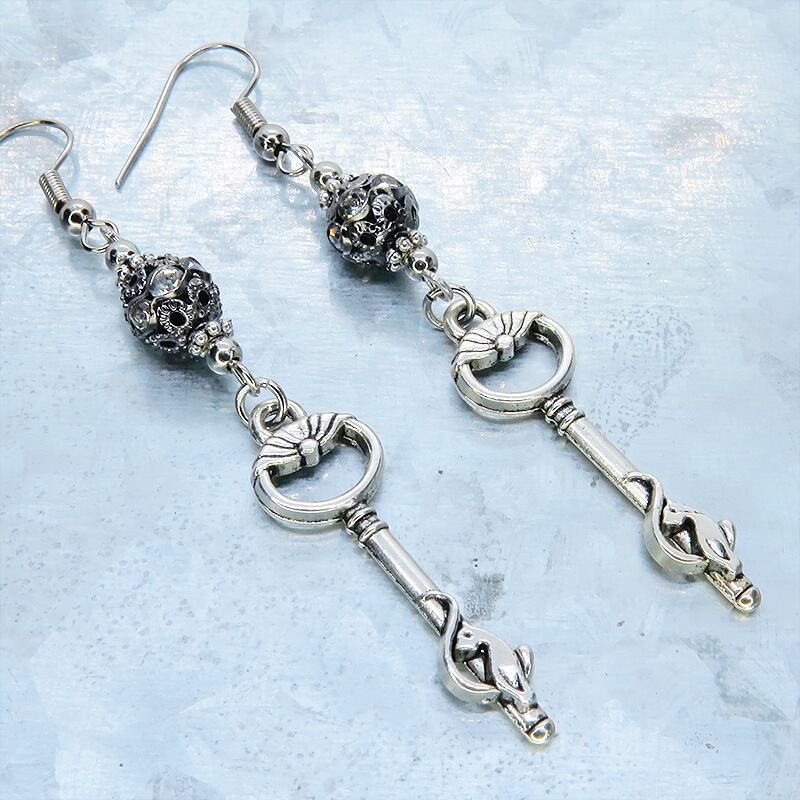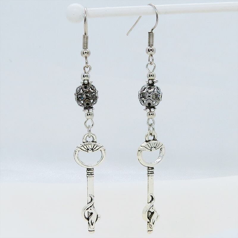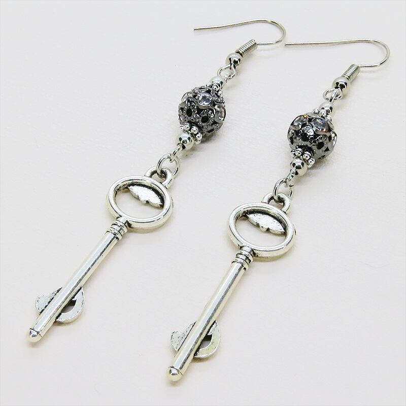 さらに、その鍵の下には、ラインストーンが埋め込まれたブラックカラーのメタルビーズが連なり、動くたびにきらめきを添えて耳元に華やかさをプラスします