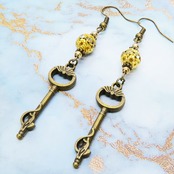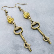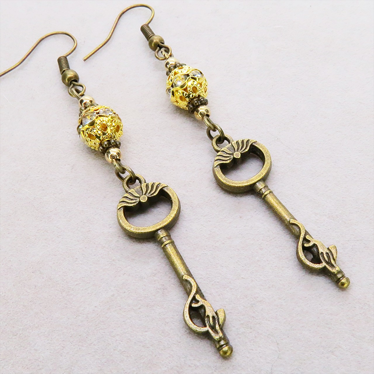 アンティークゴールド 猫が座る鍵モチーフのロングピアス ゴールドメタルビーズ ラインストーン
