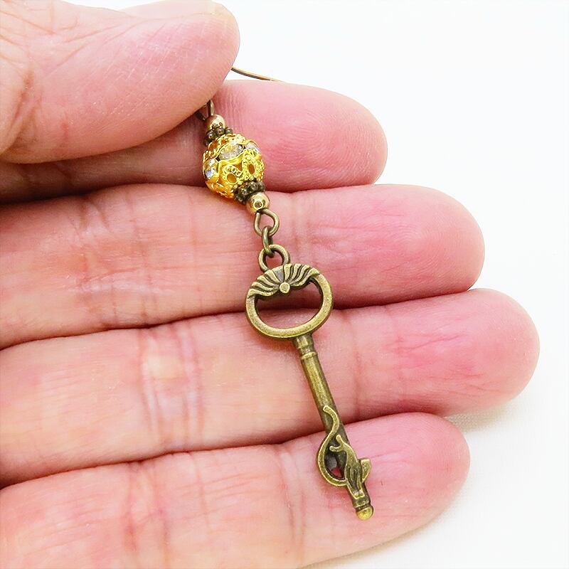 さらに、鍵の下には光を反射してきらめくラインストーンが散りばめられたゴールドカラーのメタルビーズが連なり、動くたびに華やかな輝きを放ちます