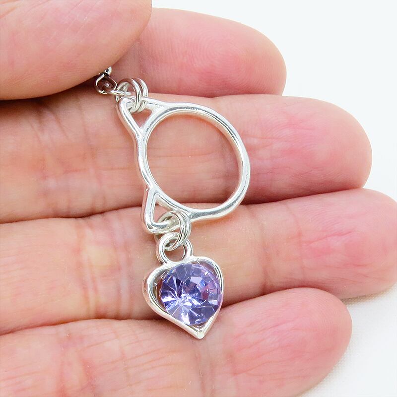 そのフレームから美しいヴァイオレットカラーのクリスタルガラスを埋め込んだハートモチーフが吊り下げられています