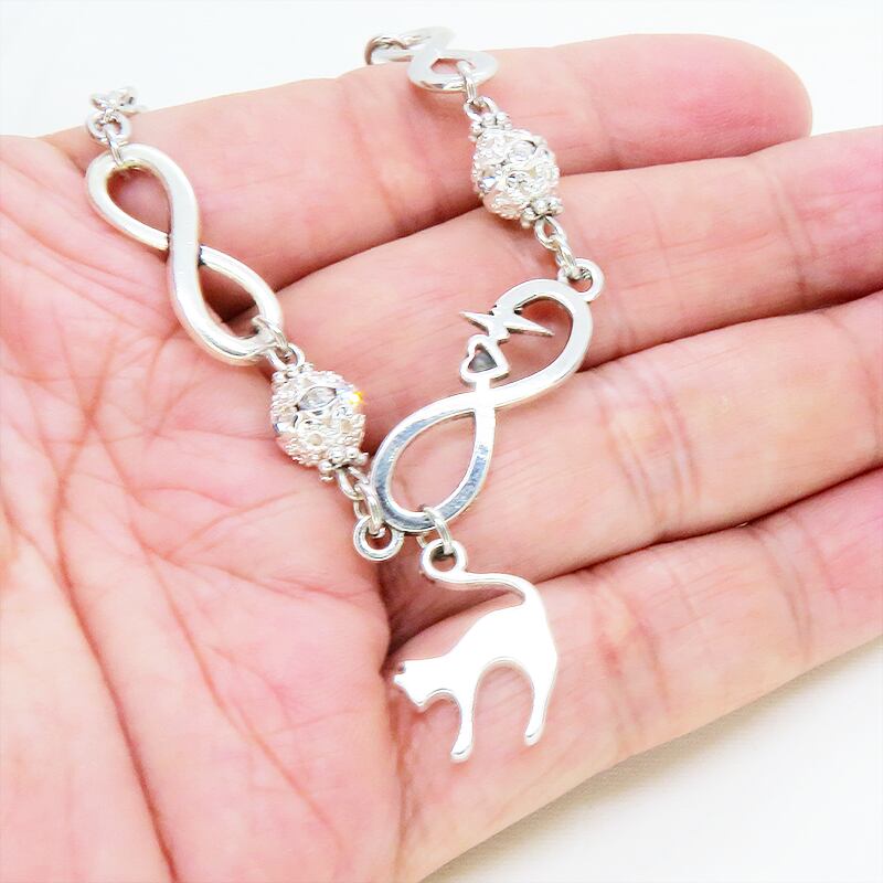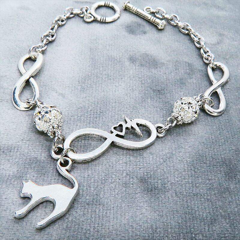 シルバーカラー 跳ね猫モチーフのブレスレット ラインストーンとエターナルモチーフのチェーン