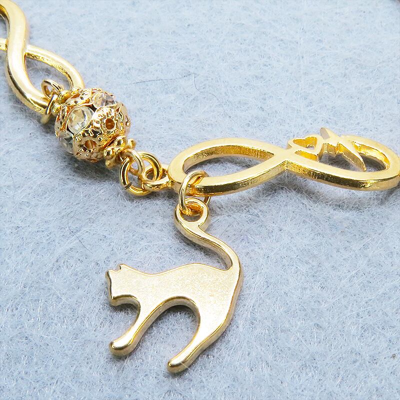 マットゴールド 跳ね猫モチーフのブレスレット ラインストーンとエターナルモチーフのチェーン
