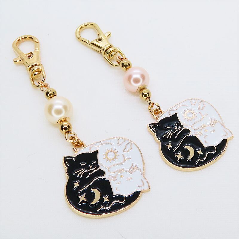 マットゴールド 白猫黒猫丸まってお休みチャームとベージュカラービーズのキーホルダー 金具変更可