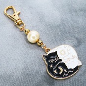 マットゴールドの輝きが上品な寄り添い眠る白猫と黒猫チャームのキーホルダーです