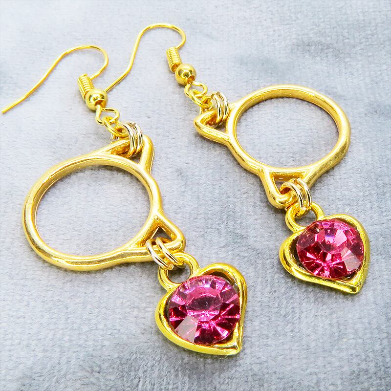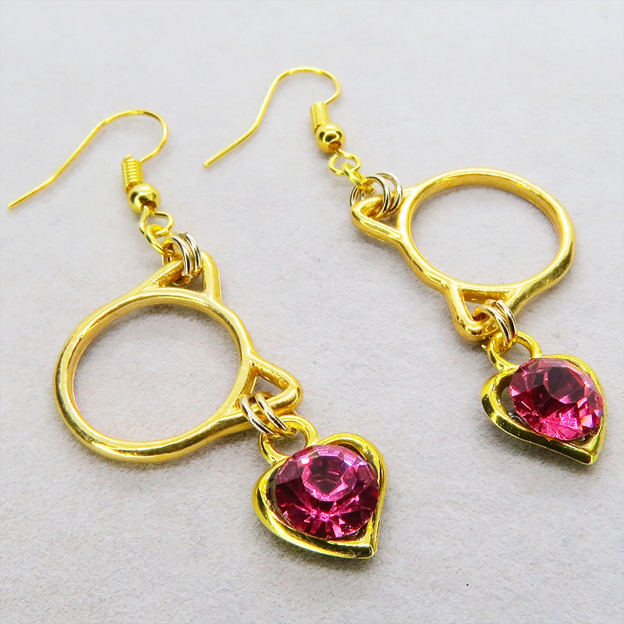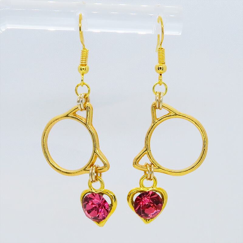 ゴールドカラーの猫のフェイスフレームに、マゼンタカラーのクリスタルガラスを埋め込んだハートモチーフが揺れ、大人可愛いデザインが魅力です