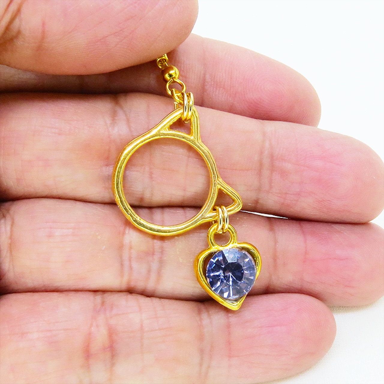 ゴールドカラーの猫のフェイスフレームに、ヴァイオレットカラーのクリスタルガラスを埋め込んだハートモチーフが揺れ、大人可愛いデザインが魅力です