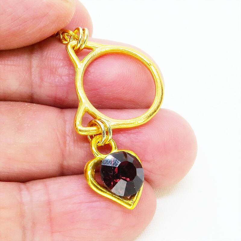 そのフレームから美しいガーネットカラーのクリスタルガラスを埋め込んだハートモチーフが吊り下げられています
