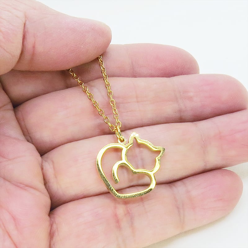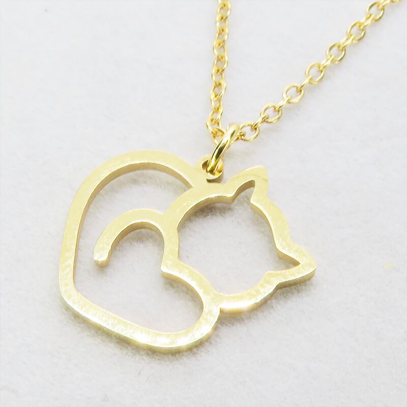 ゴールドカラー ステンレス製 柔らかい曲線の猫シルエットモチーフのネックレス 長さ調整可