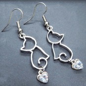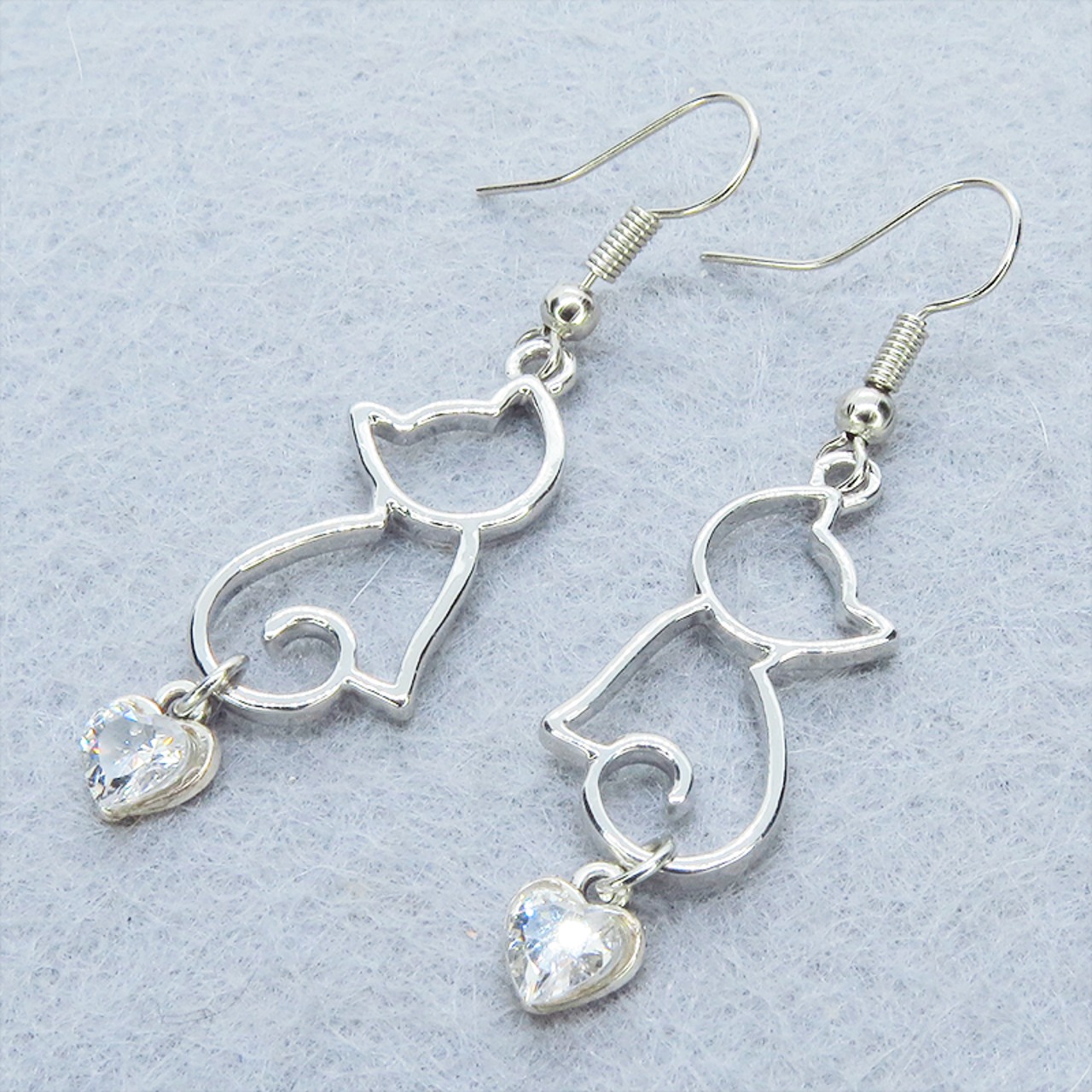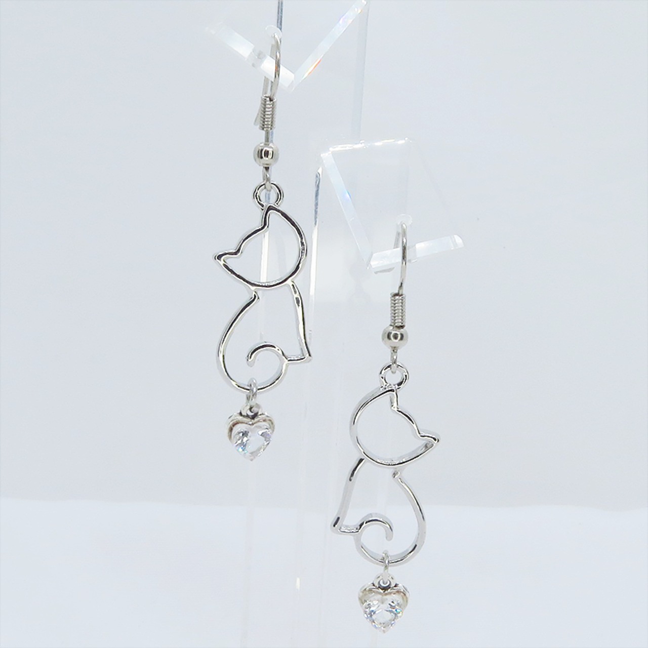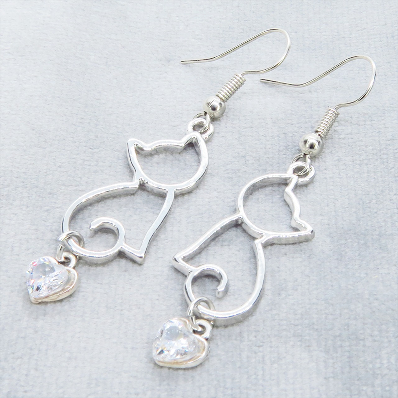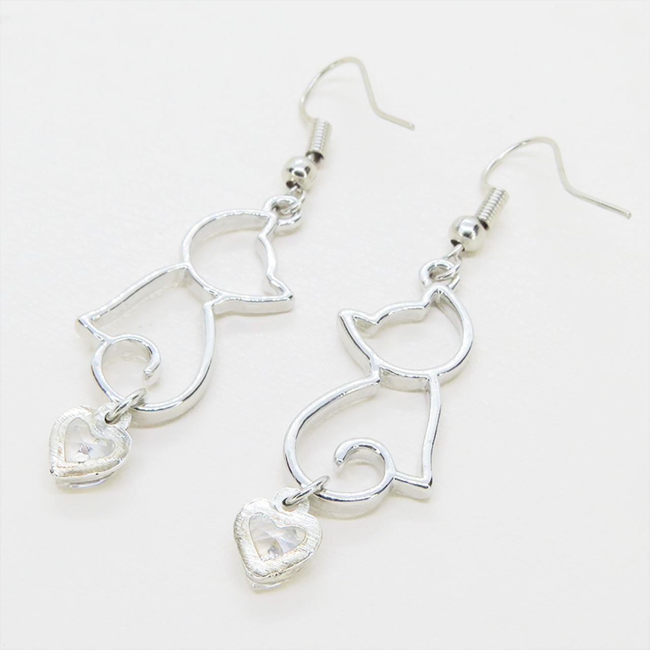 シルバーカラー 猫シルエットとスワロフスキーのハートを組合せた大人可愛いピアス サージカル可
