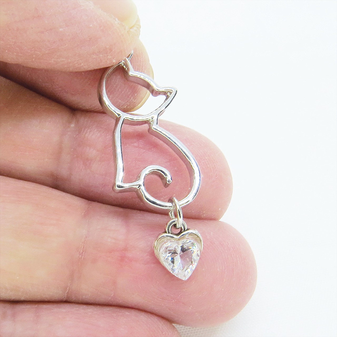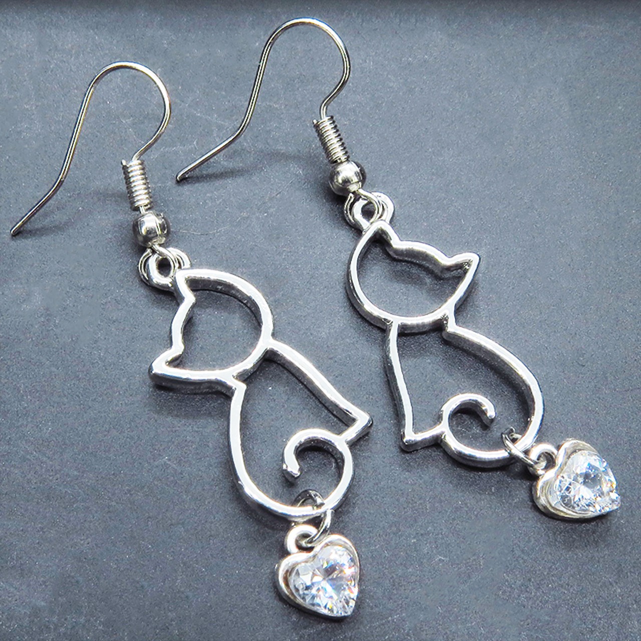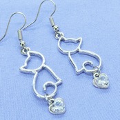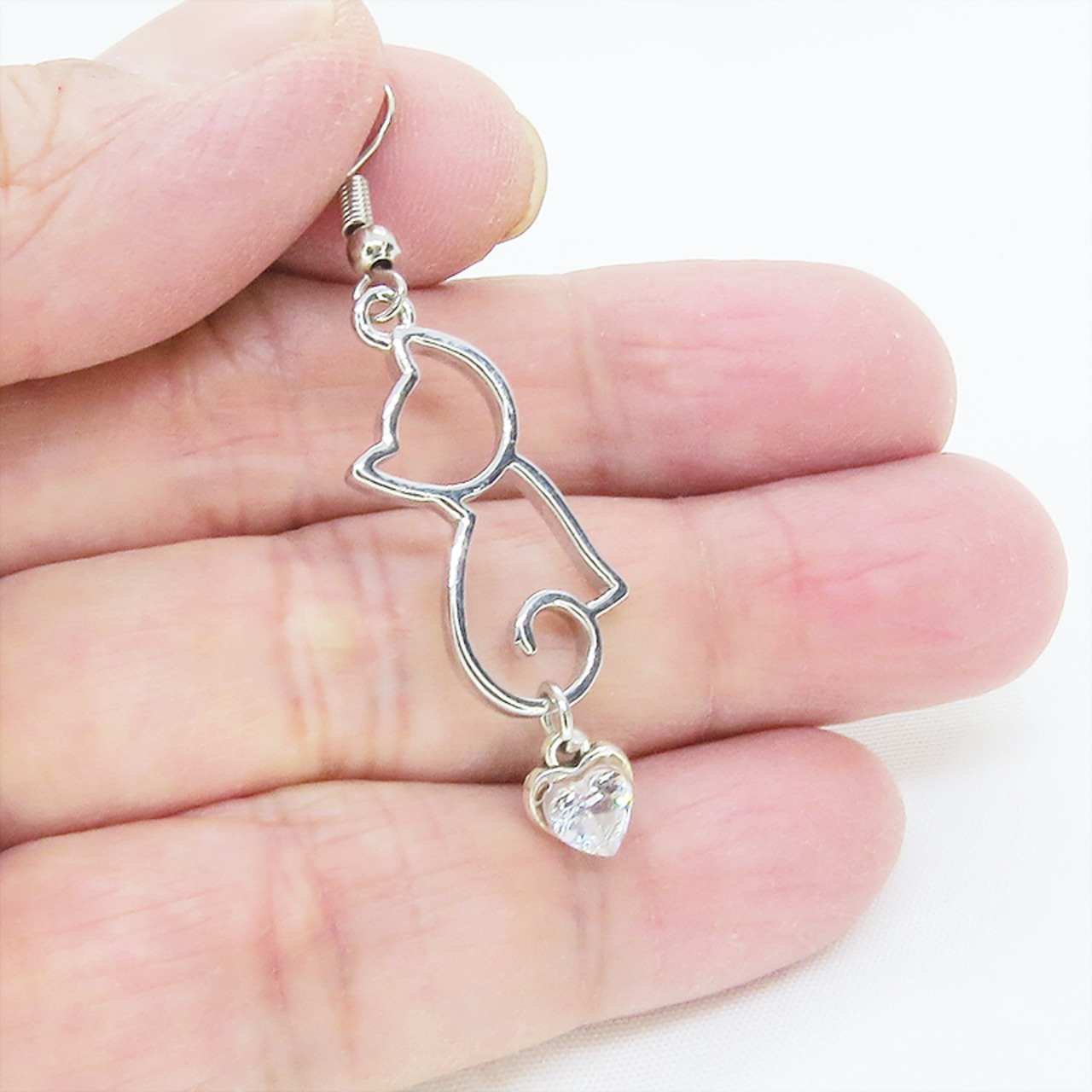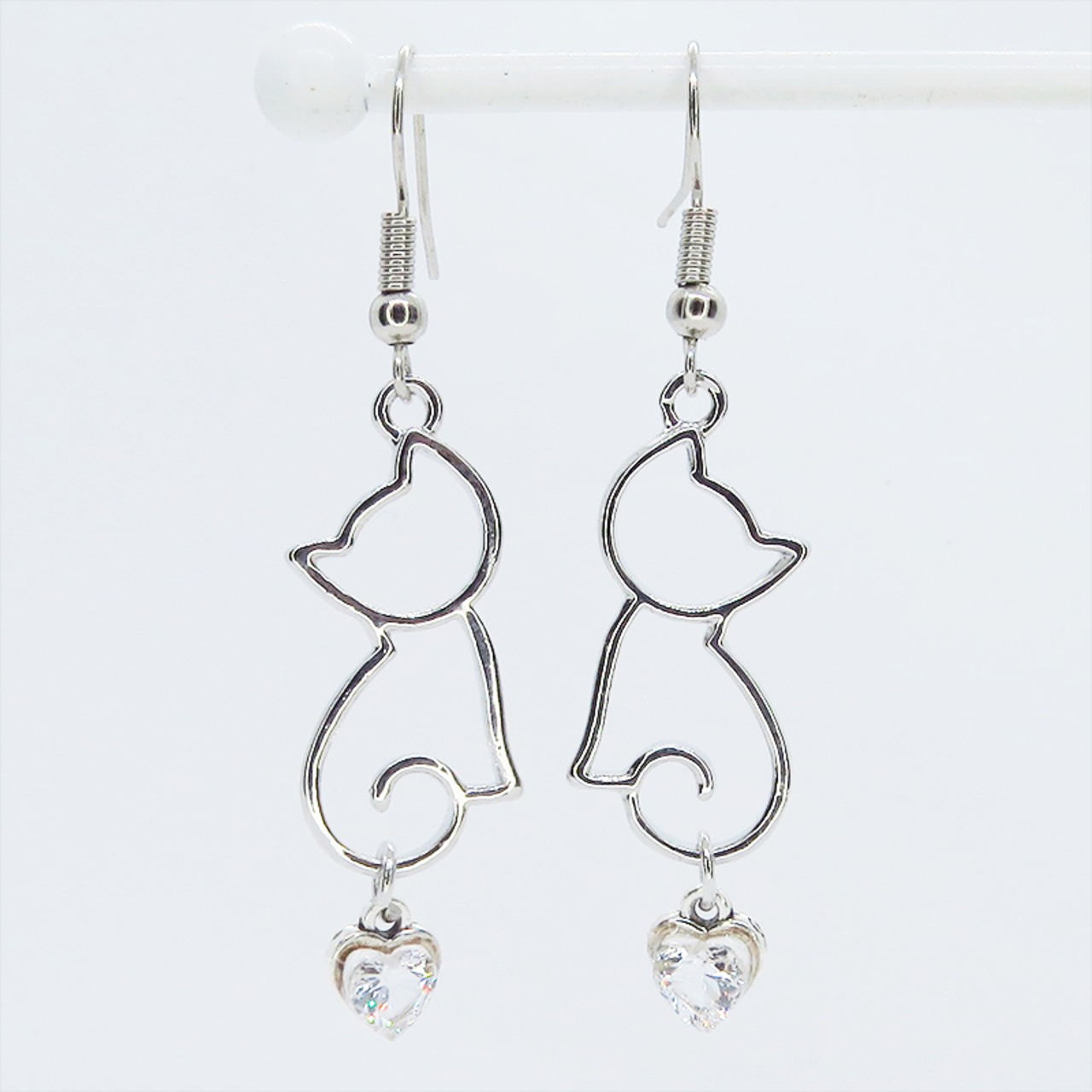 シルバーカラー 猫シルエットとスワロフスキーのハートを組合せた大人可愛いピアス サージカル可