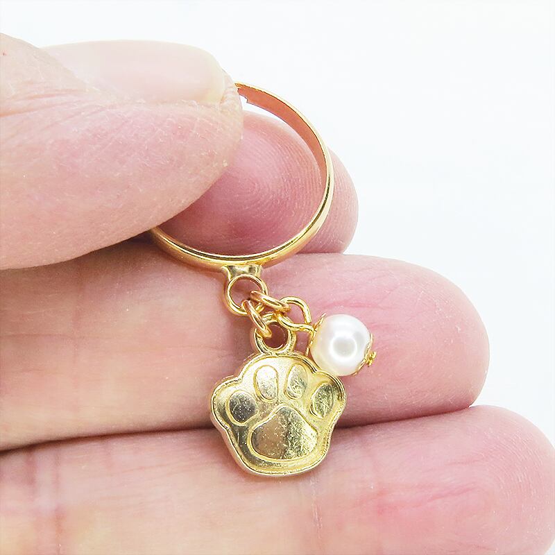 温かみと華やかさのあるマットゴールドで統一し、プニッとした形が可愛らしい肉球チャームと上品なスワロフスキー・パールをあわせました