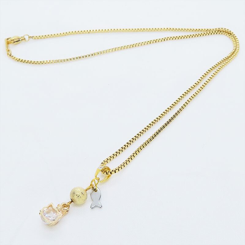 ご使用後は、柔らかい布で皮脂や汗を優しく拭き取ってください。チェーンはステンレス製で錆びにくい素材ですが、輝きを保つために水濡れや汗、化粧品との接触はできるだけ避けることをおすすめします。チャーム部分はデリケートですので、引っかかりや強い衝撃にご注意の上、直射日光を避けて保管してください