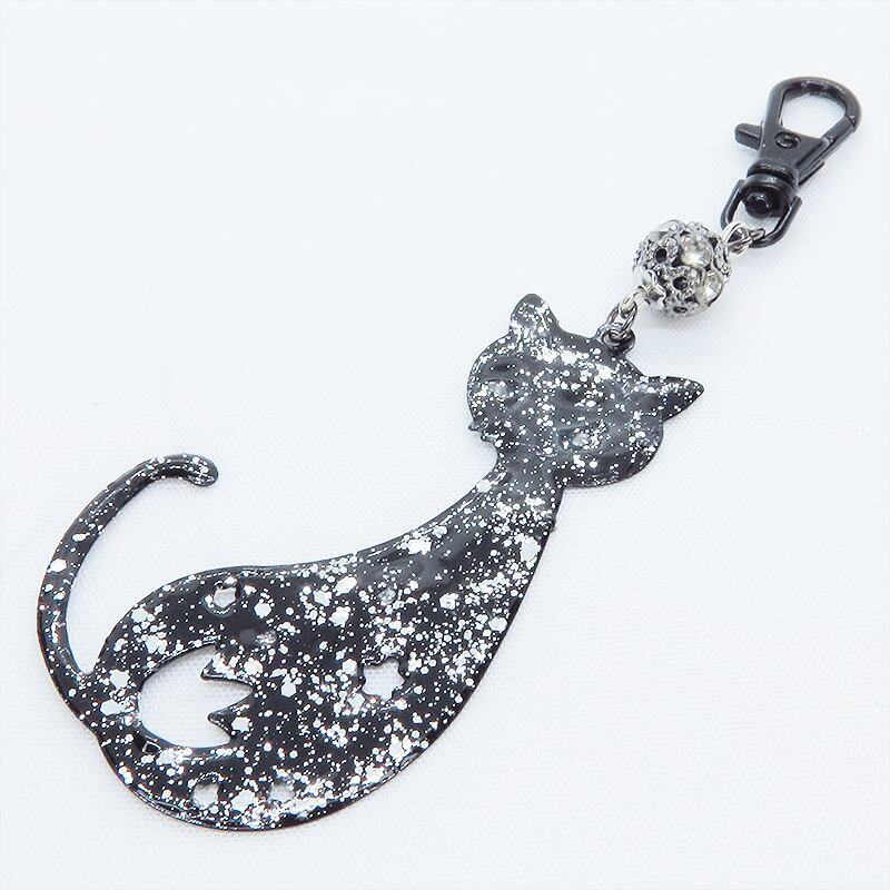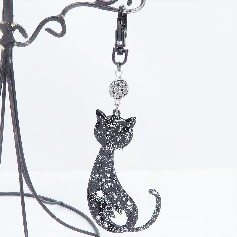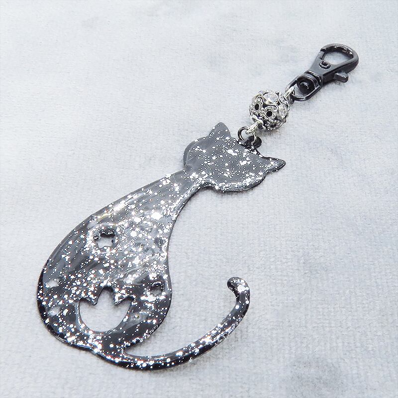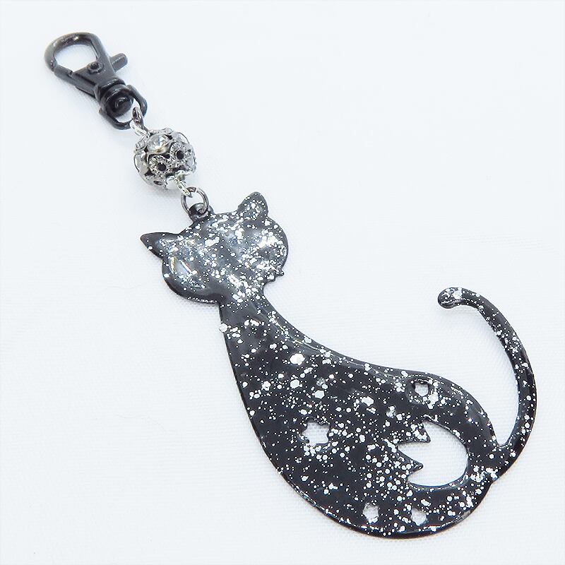 ラメ入り黒猫モチーフの大人可愛いキーホルダー レジンコーティング ブラックメタルビーズ金具変更可