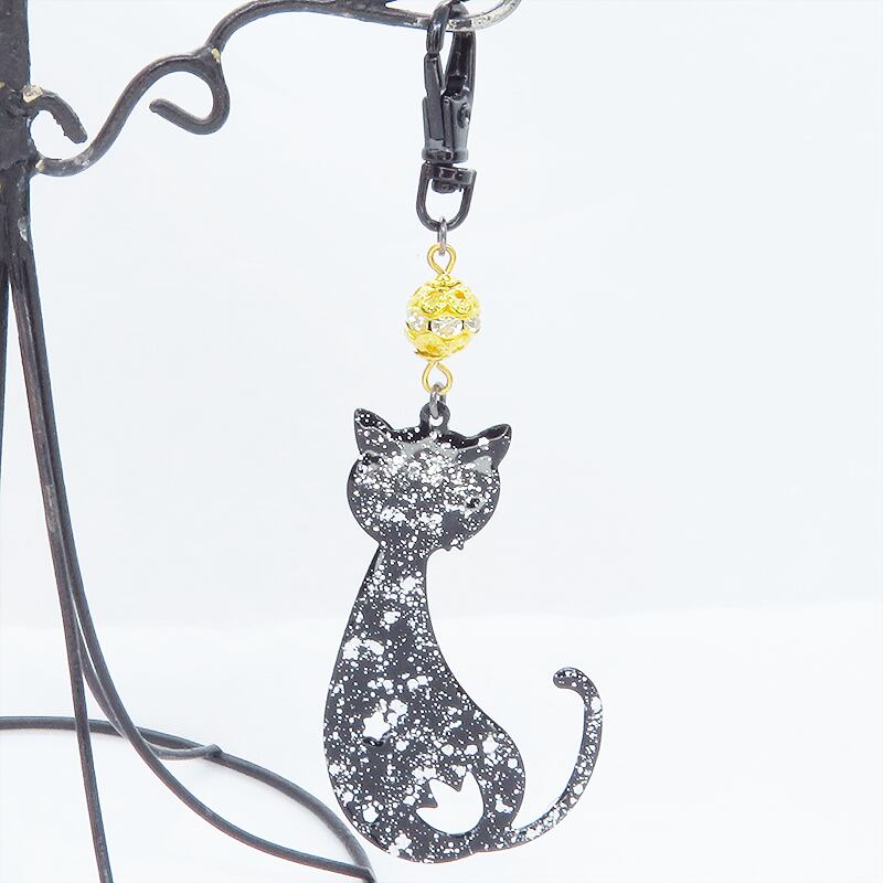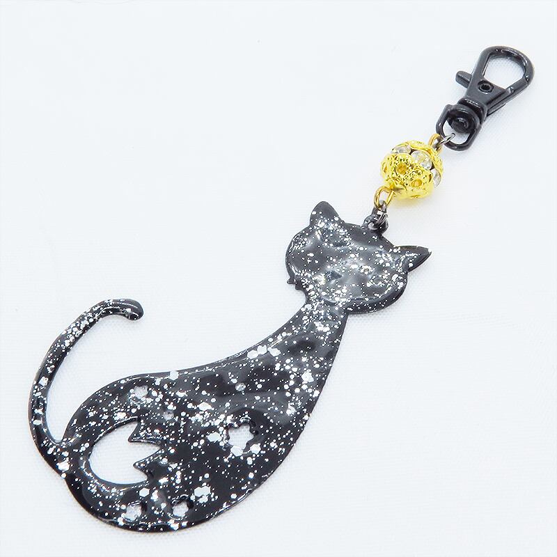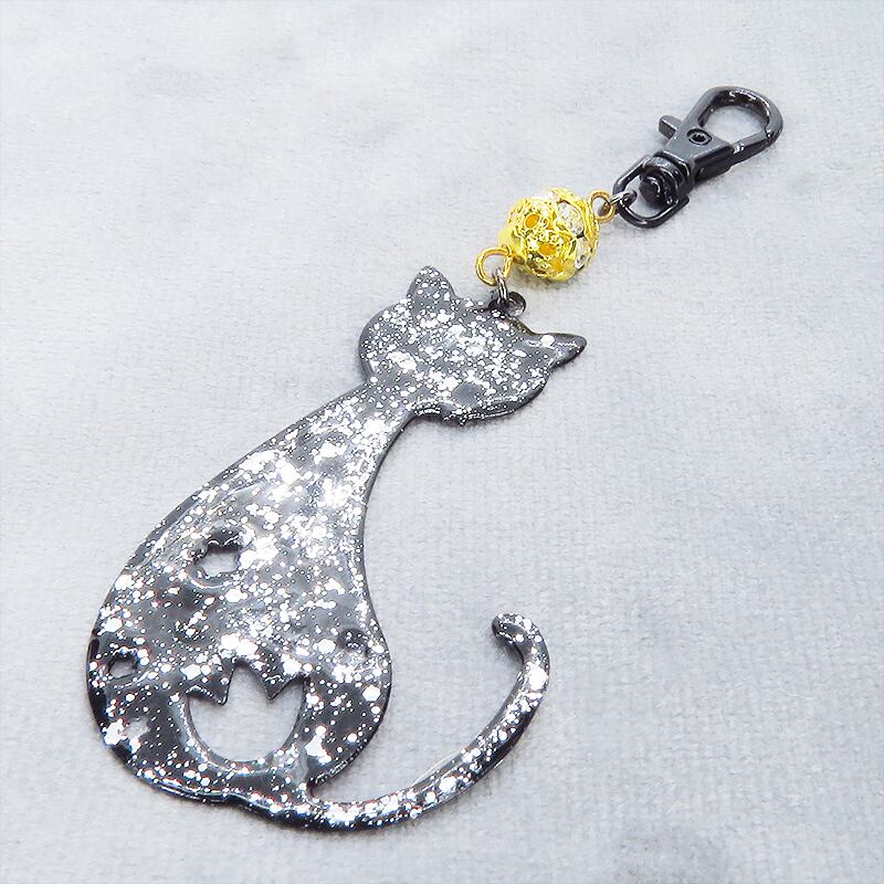ラメ入り黒猫モチーフの大人可愛いキーホルダー レジンコーティング ゴールドメタルビーズ金具変更可
