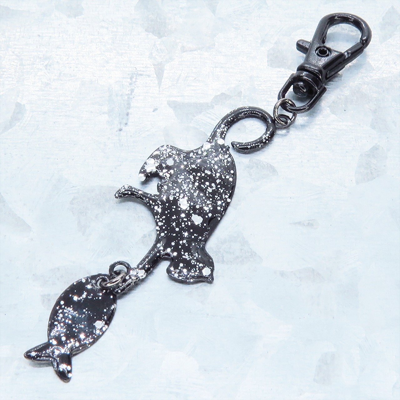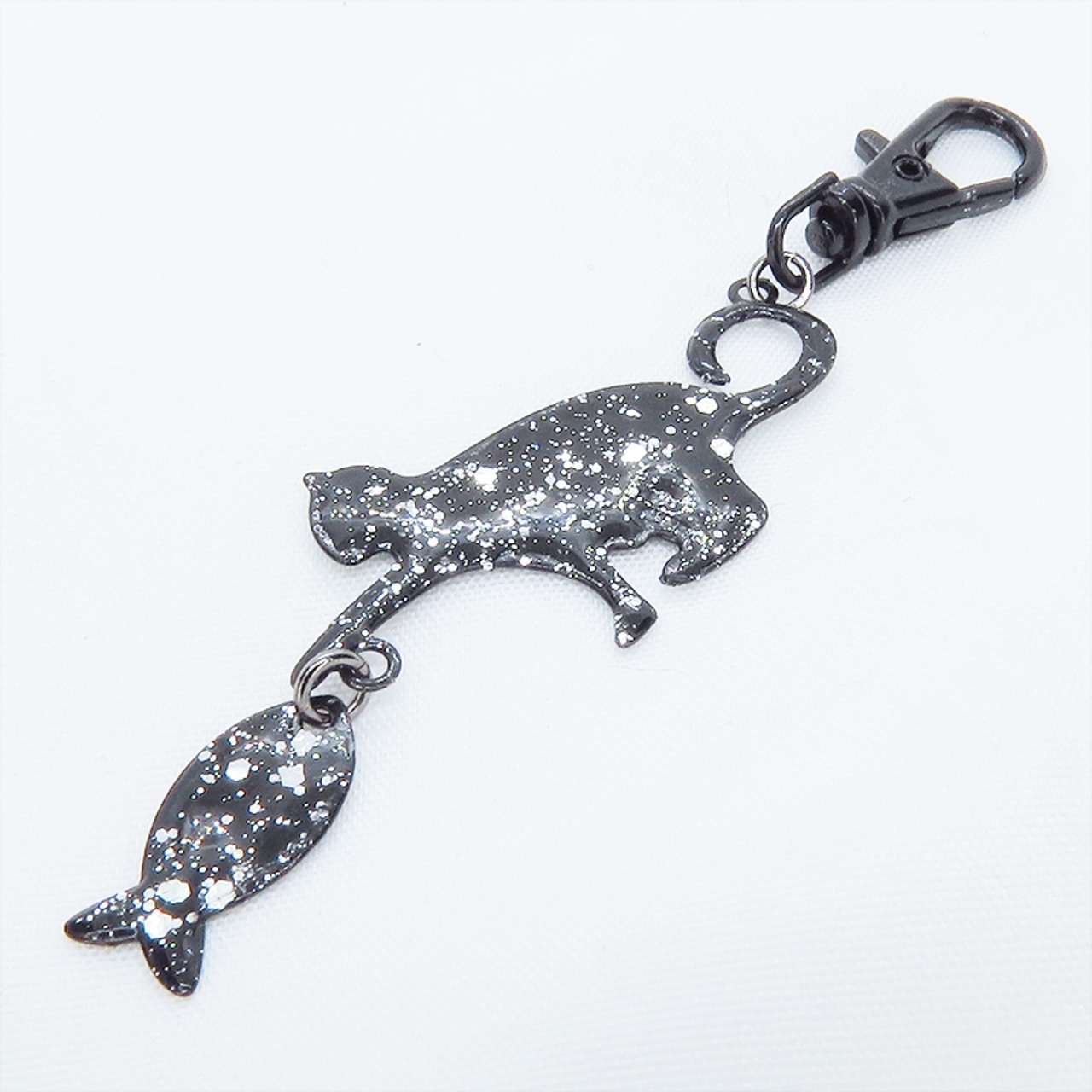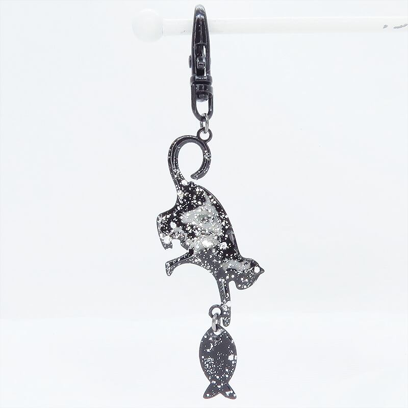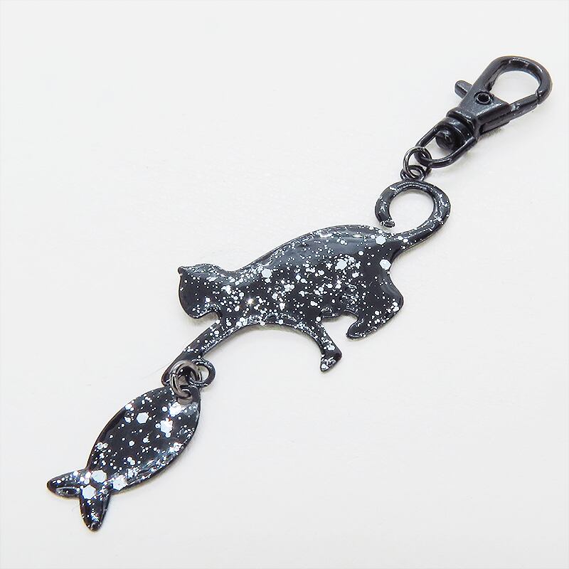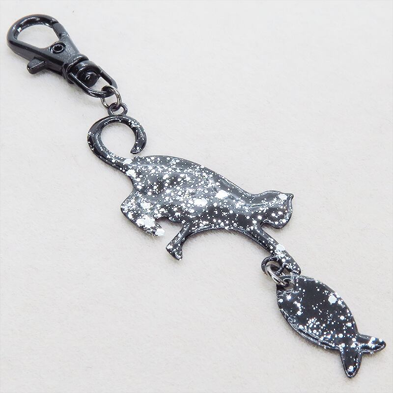 ステンレス製 ブラックカラー 魚を狩る猫のシルエットモチーフのキーホルダー ラメ入り ステンレス板 金具変更可