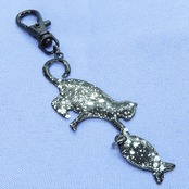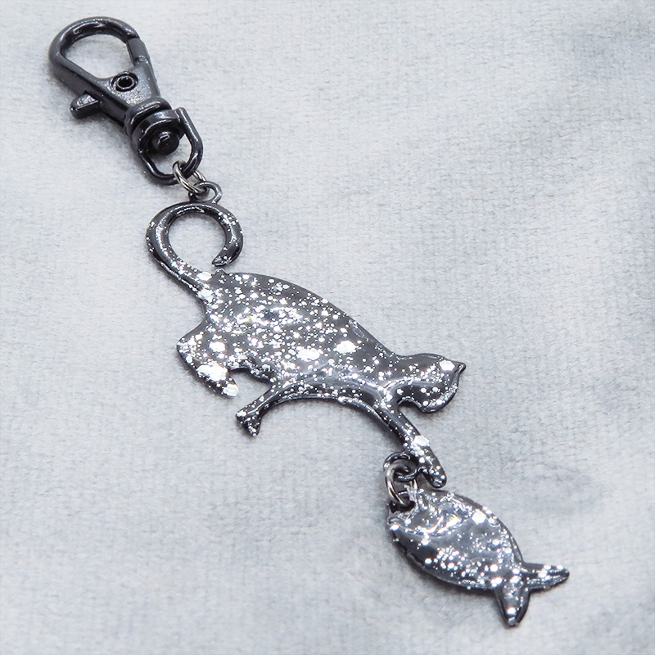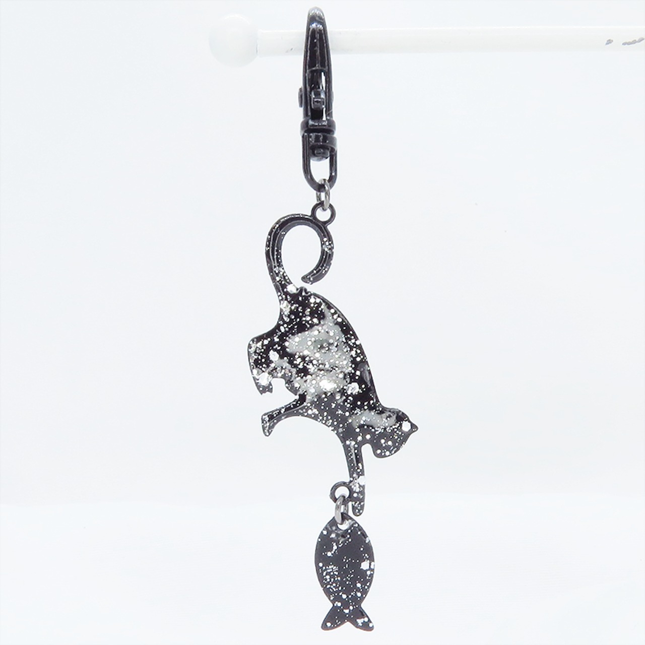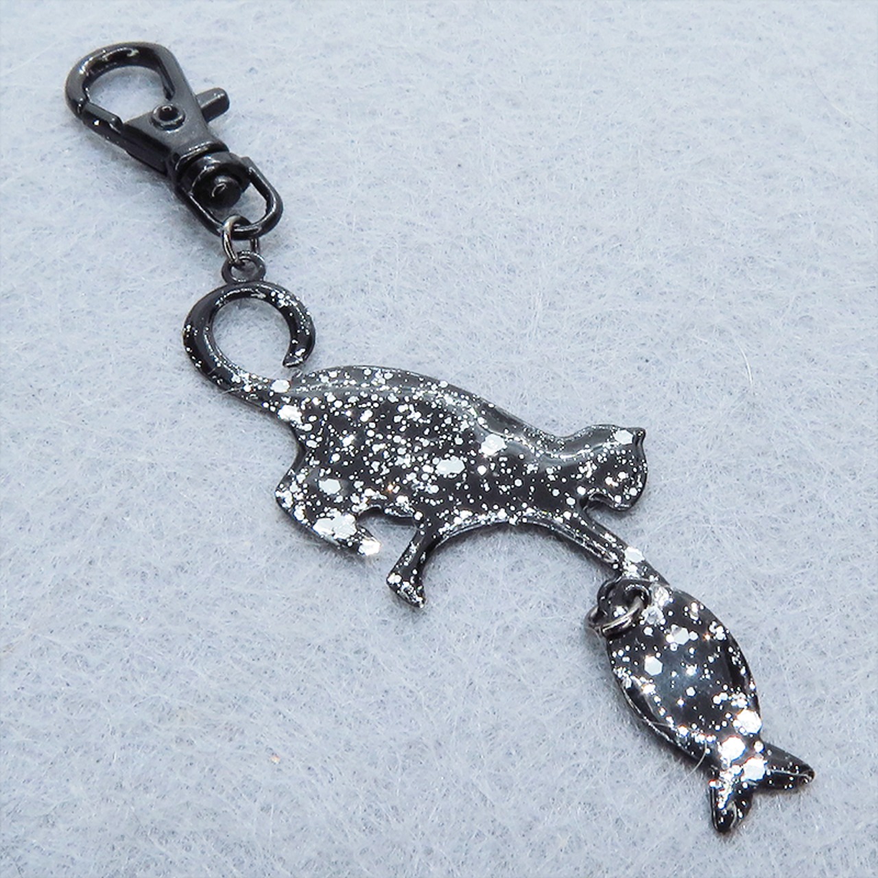 ステンレス製 ブラックカラー 魚を狩る猫のシルエットモチーフのキーホルダー ラメ入り ステンレス板 金具変更可