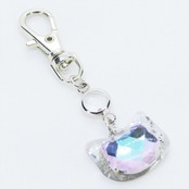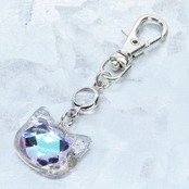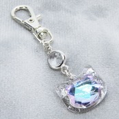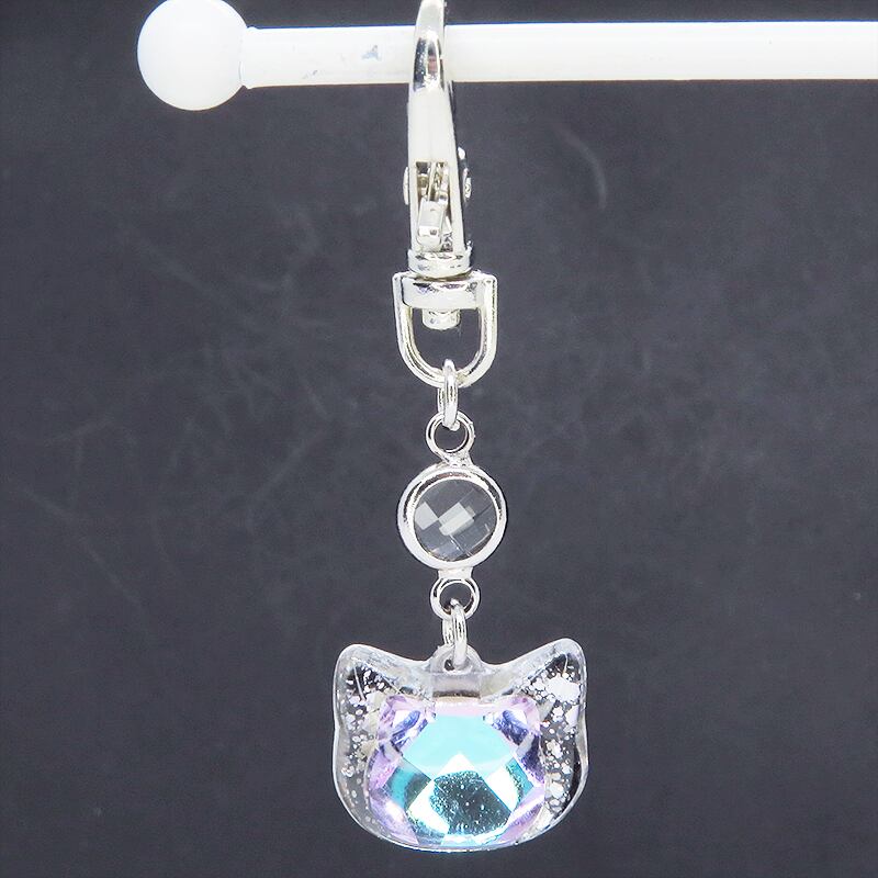 シルバーカラー 猫フェイスモチーフのローズレインボークリスタルのペンダントキーホルダー レジン 金具変更可