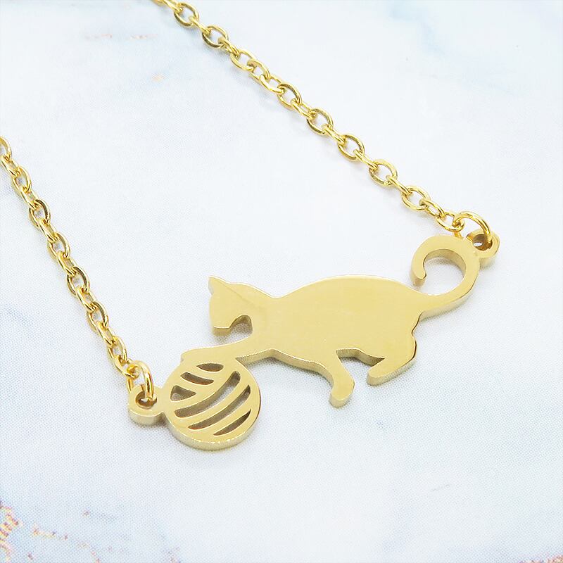 ステンレス製 ゴールドカラー 球にじゃれるシルエット猫モチーフのネックレス アジャスター可