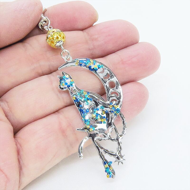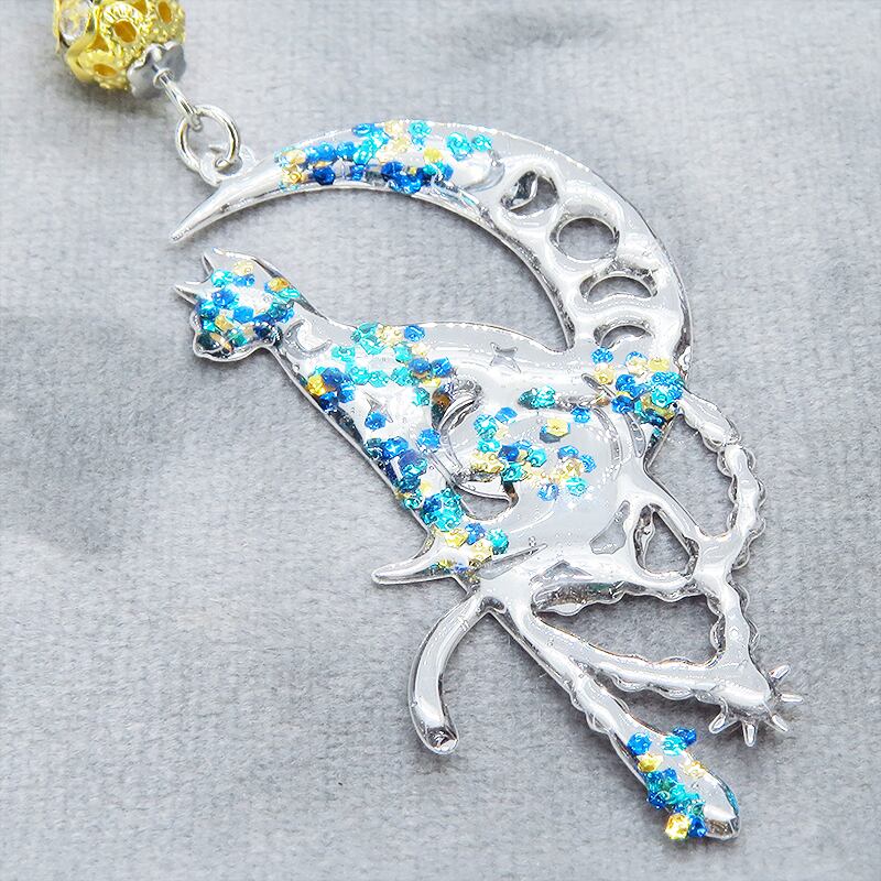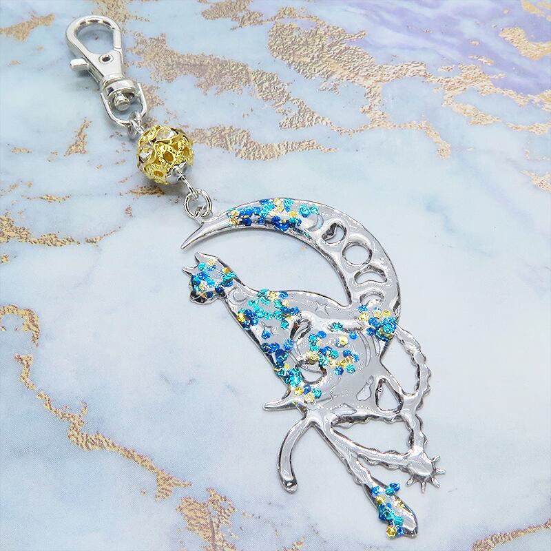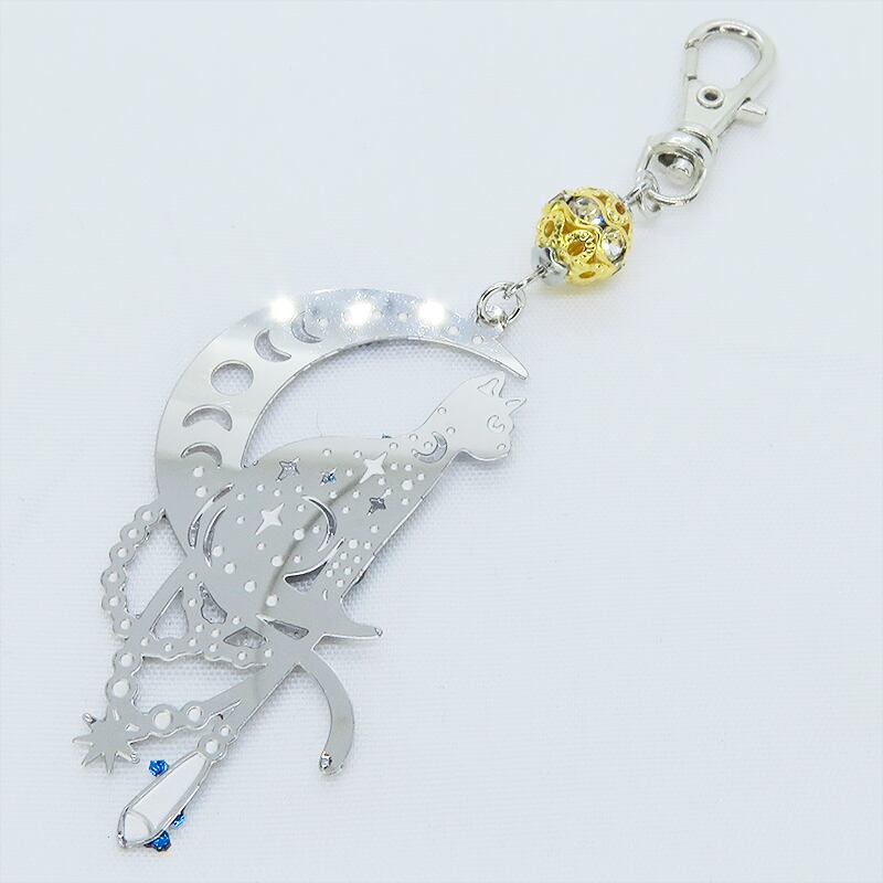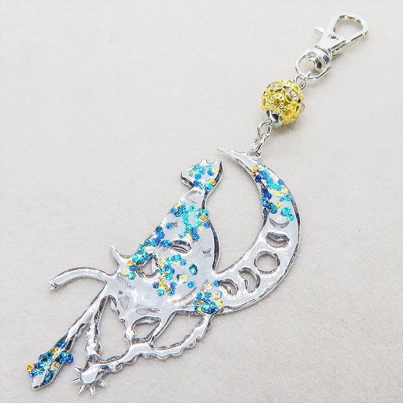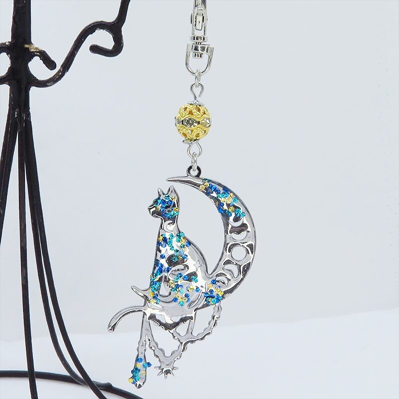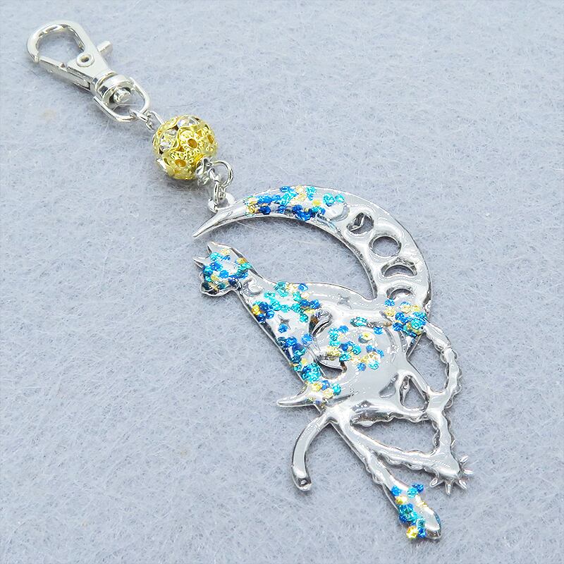 ステンレス製 シルバーカラー 三日月に乗る猫シルエットのキーホルダー ラインストーン レジン加工 ゴールドカラーメタルビーズ 金具変更可