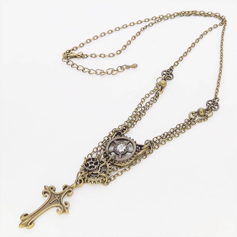 アンティークゴールド 猫とロザリオのスマートなスチームパンク風ダブルチェーン ネックレス アジャスター付 長さ調整可