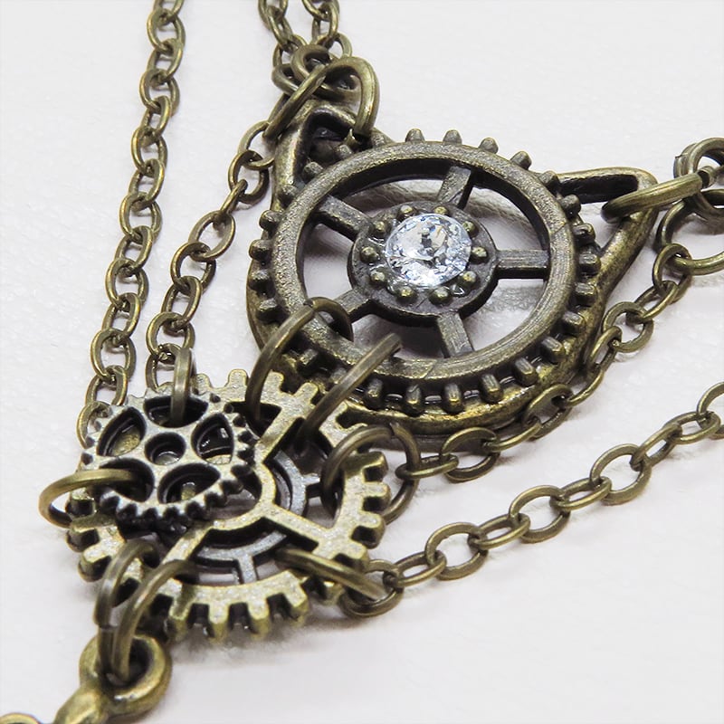 ご使用後は、柔らかい布で皮脂や汚れを優しく拭き取ってください。複数のチェーンや細かな歯車のパーツ、中央のスワロフスキーなど、非常に繊細な構造になっておりますので、衣服への引っかかりや強い衝撃には十分ご注意ください。アンティークゴールドの深みのある風合いを長く保つため、水濡れや汗を避け、湿気の少ない場所で大切に保管することをおすすめします