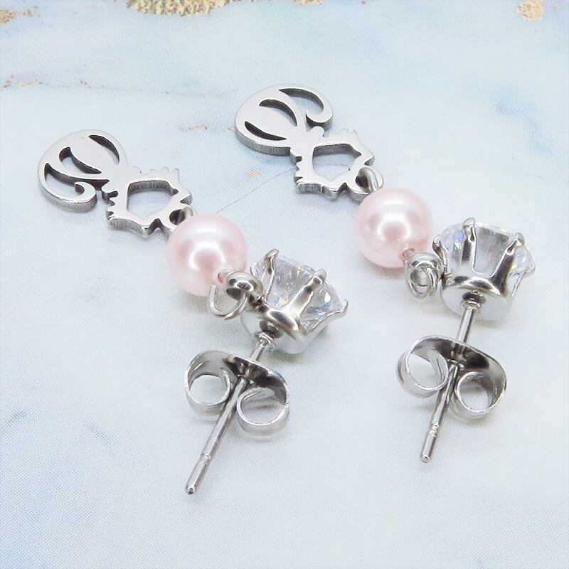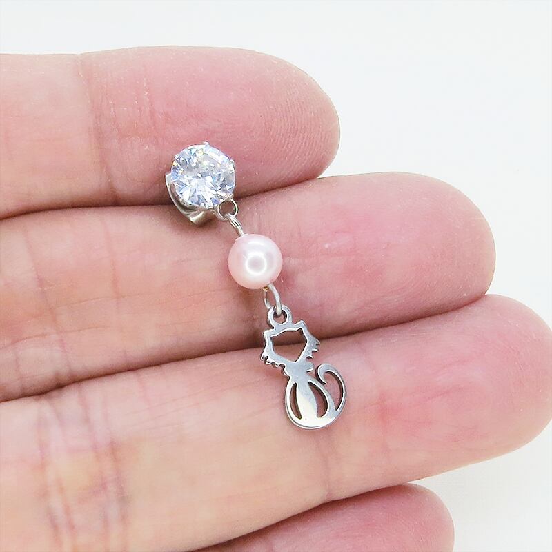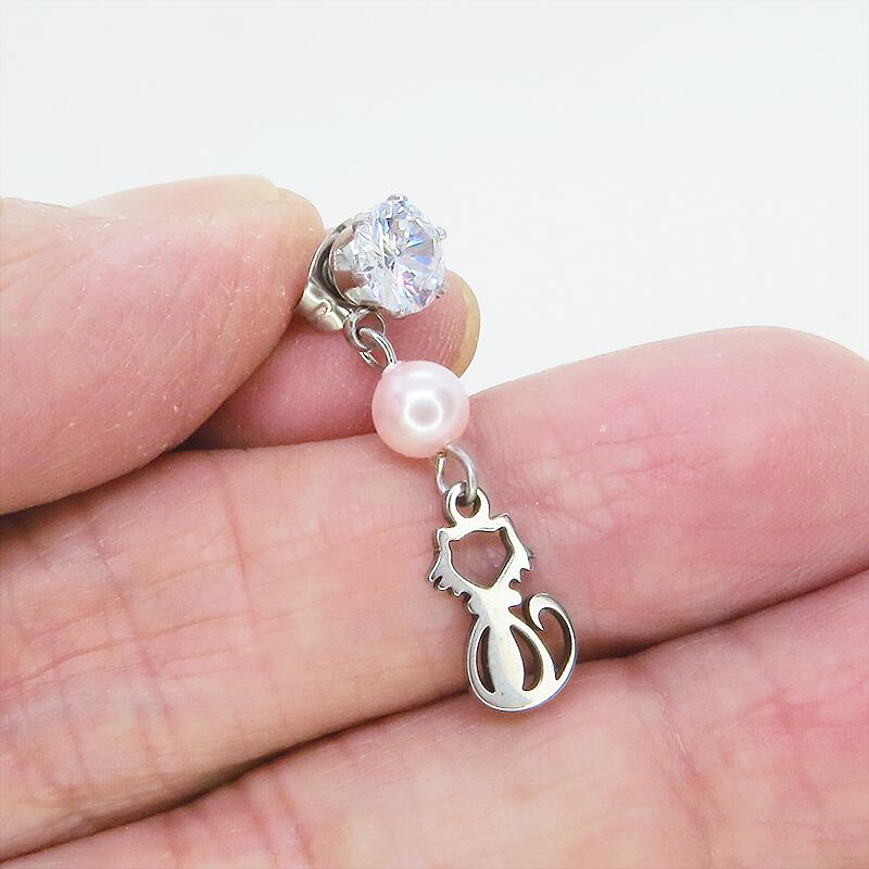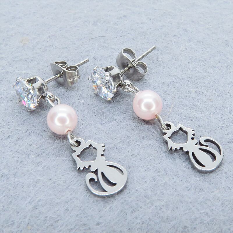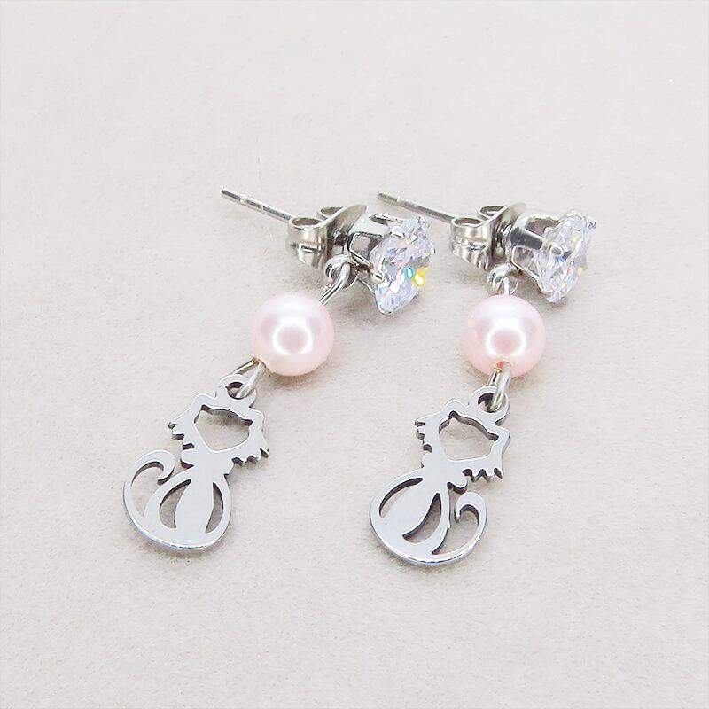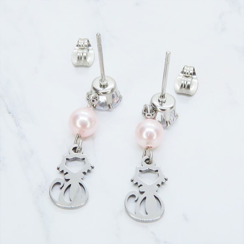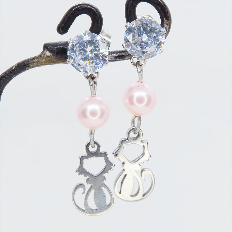 ステンレス 猫シルエットとジルコンのスタッドピアス スワロフスキーパール(ロザリン)