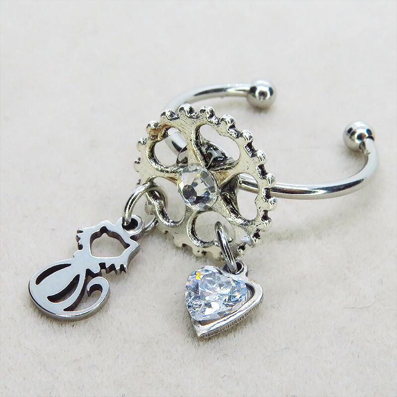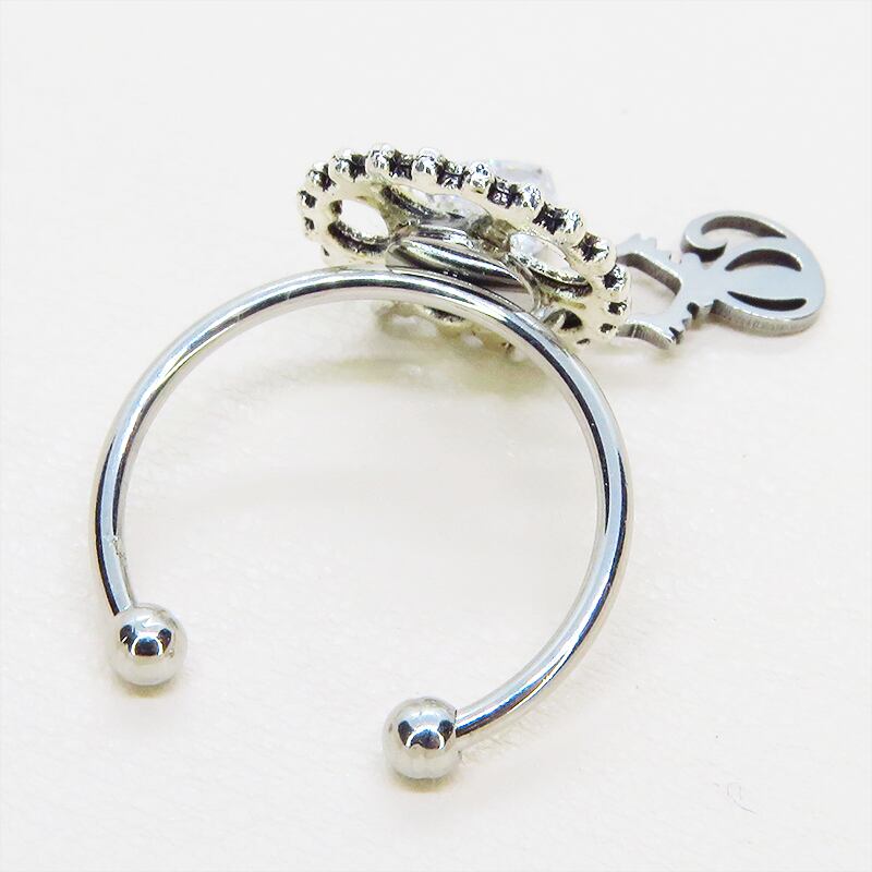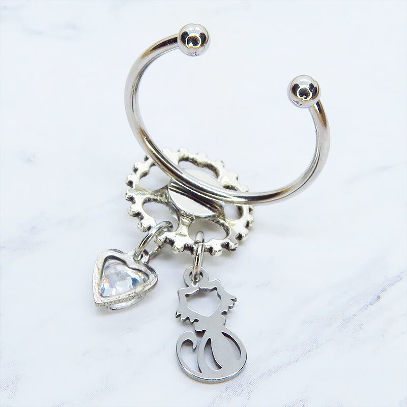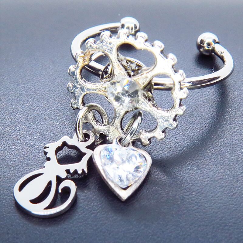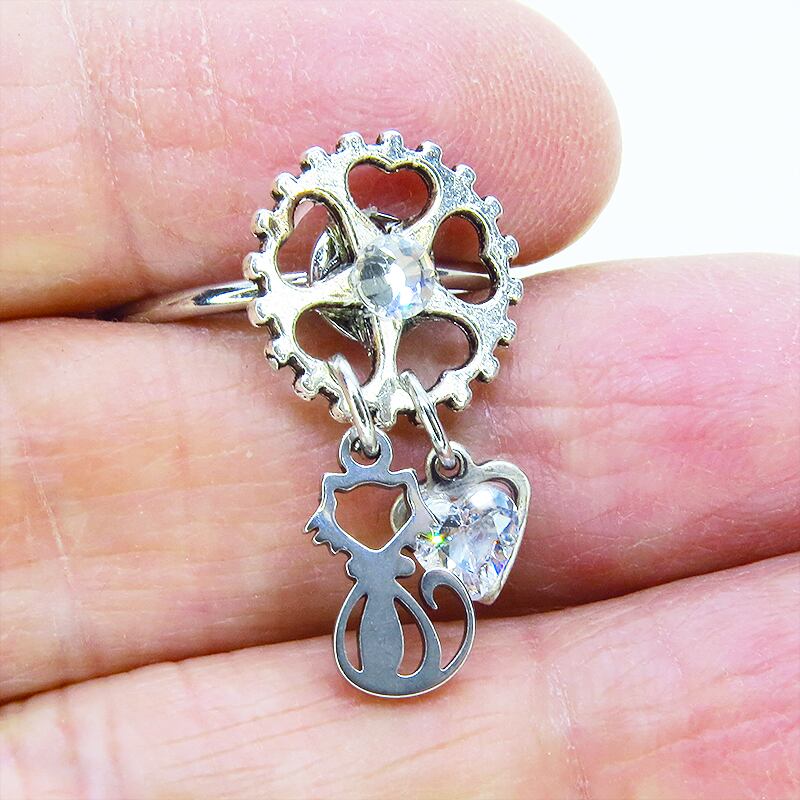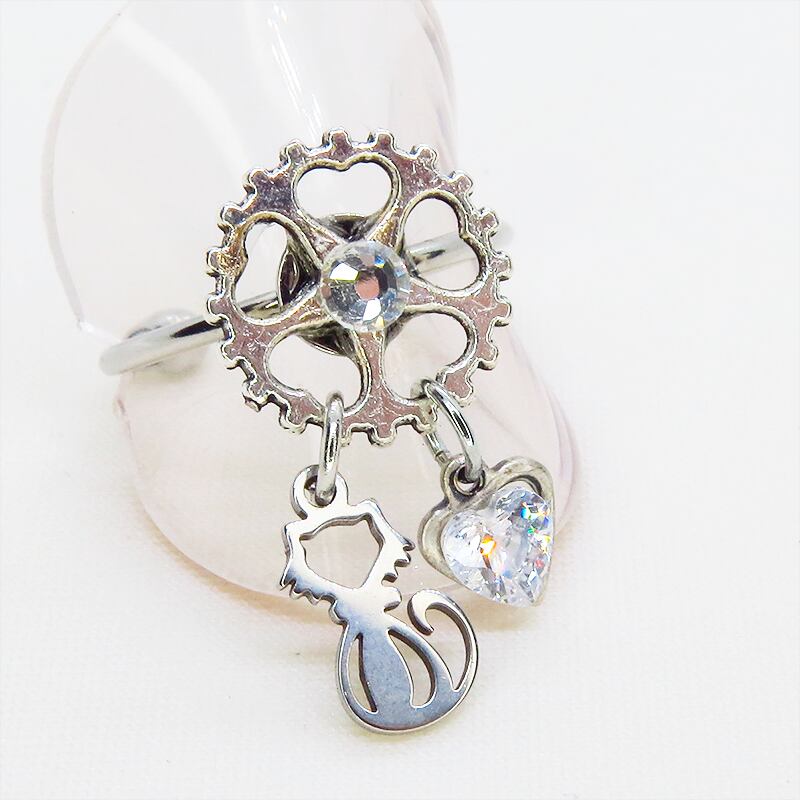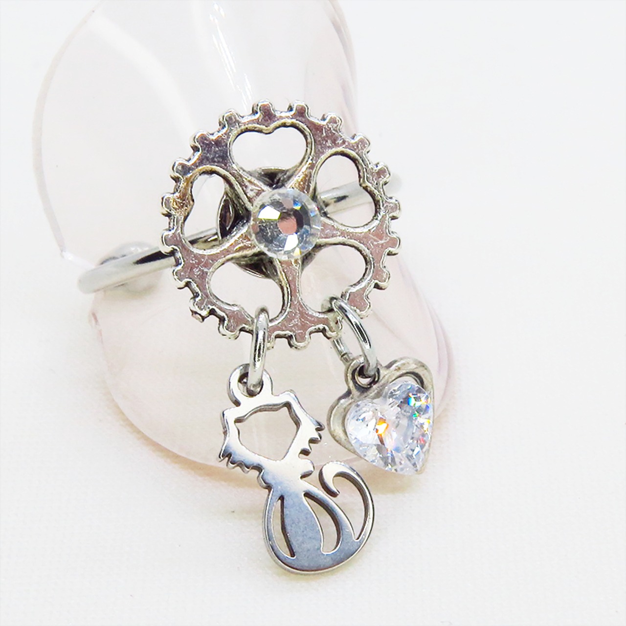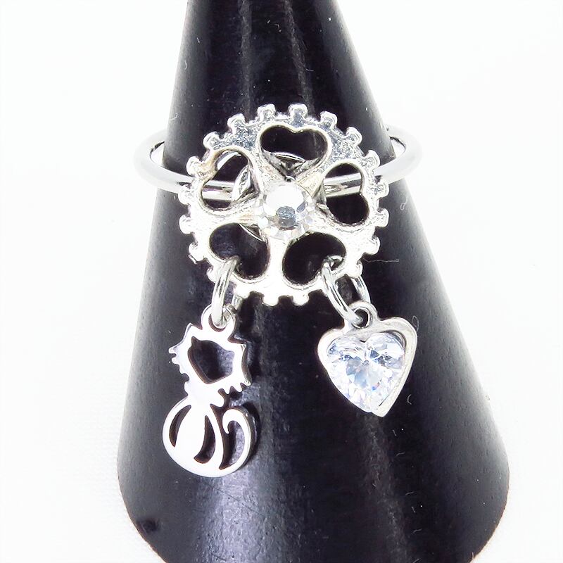 シルバーカラー 歯車に猫とハートのチャームを吊り下げた大人可愛いリング フリーサイズ スワロフスキー
