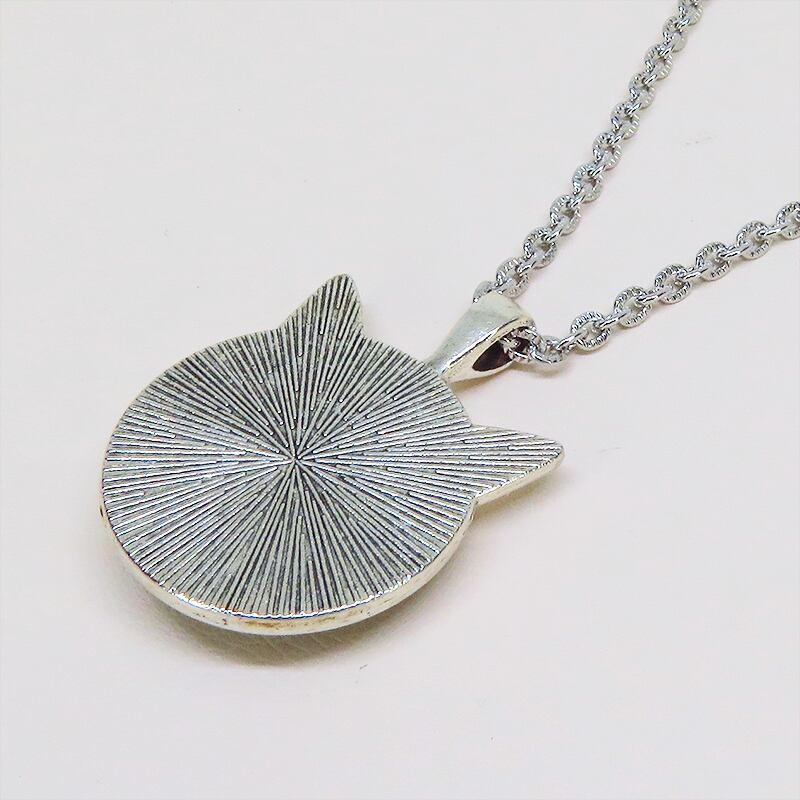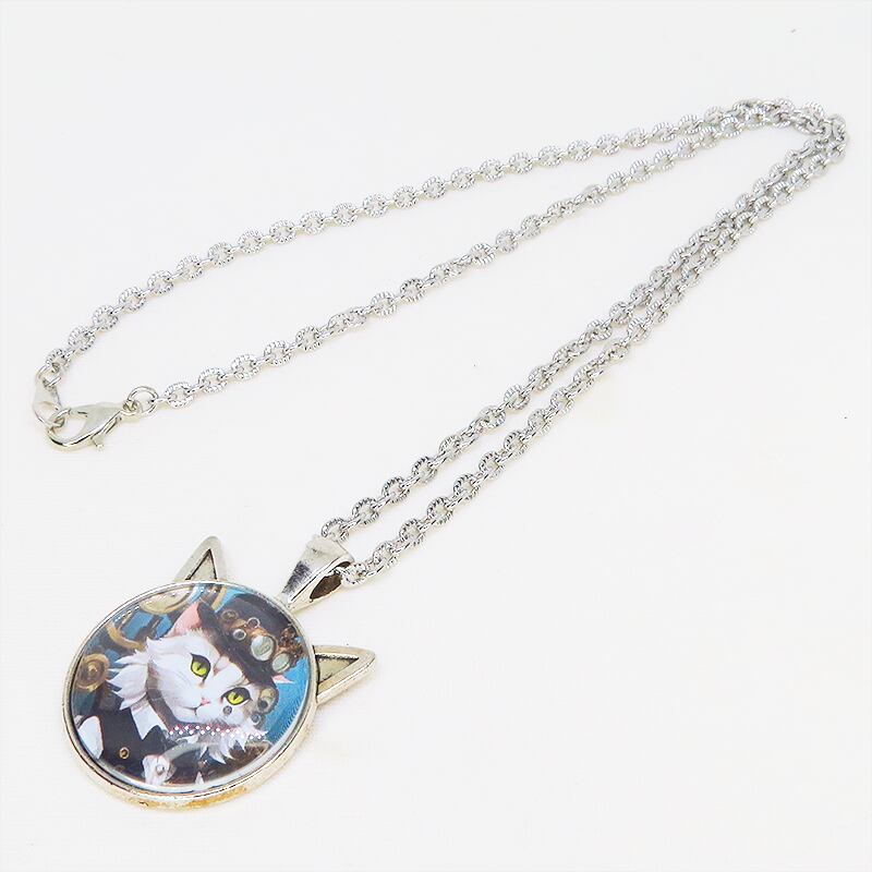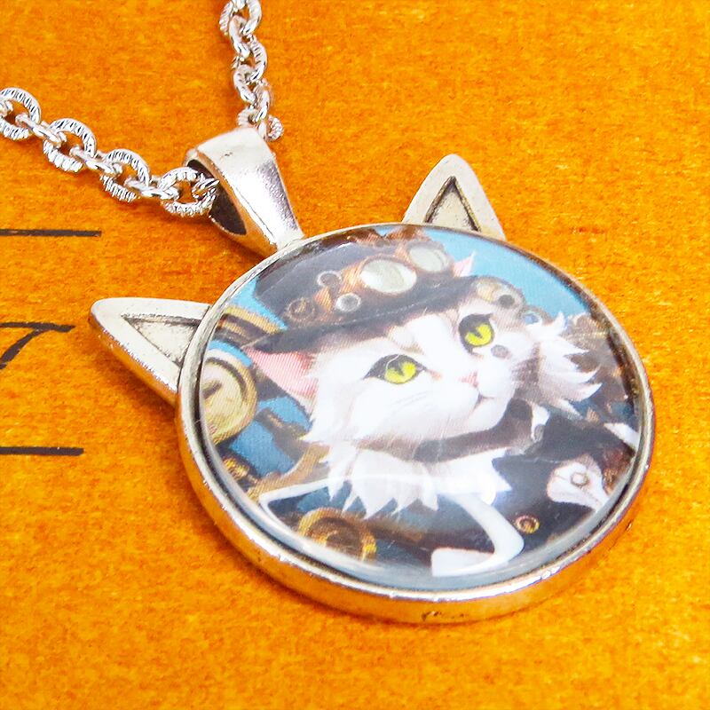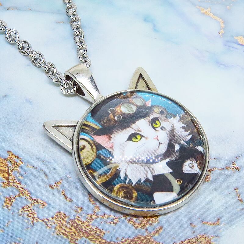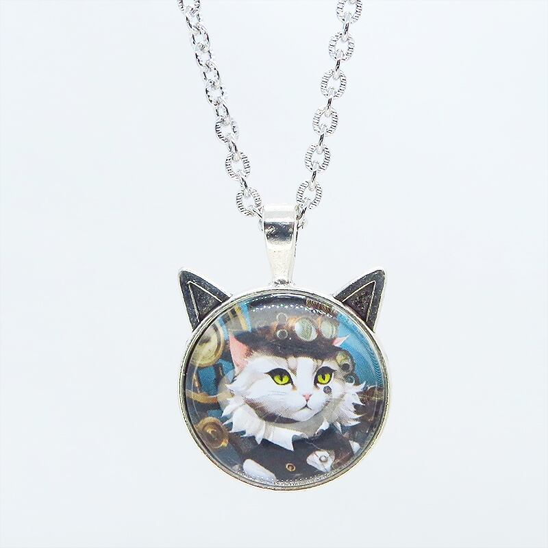 凛としたシルバーカラーのフレームにシルクハットを被った白猫のスチームパンクイラストを使った猫耳型カボションペンダントネックレスです