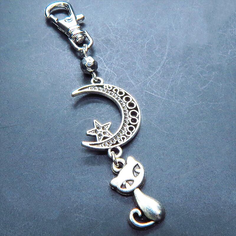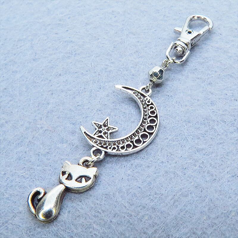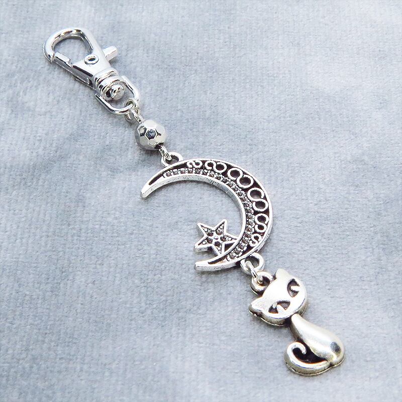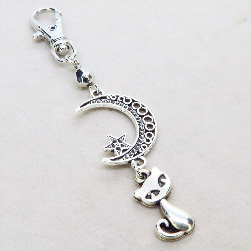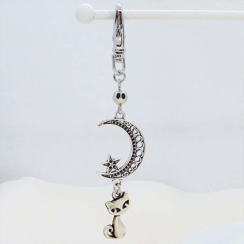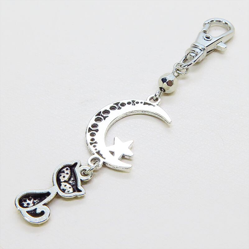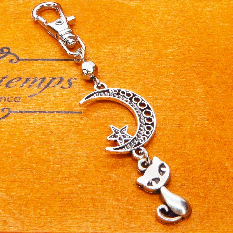 アンティークシルバー 三日月と猫を組合せたコンパクトなキーホルダー 金具交換可