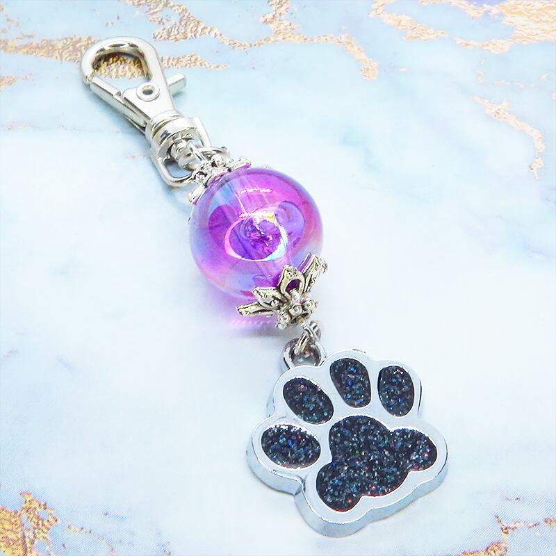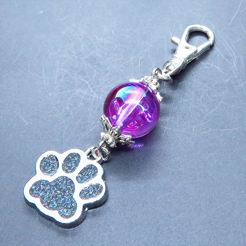 シルバーカラー 大きめ肉球チャームとヴァイオレットのビーズを組合せたキーホルダー 金具変更可