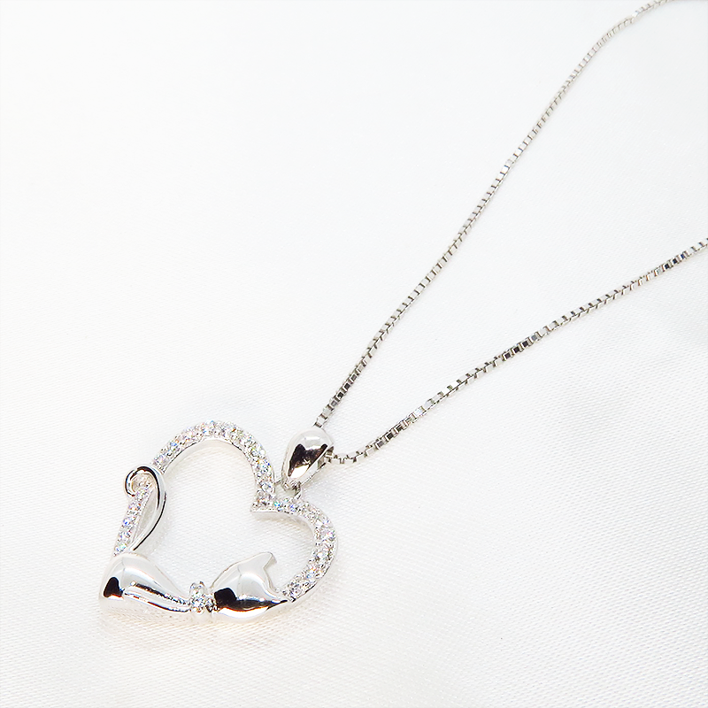 寝そべる猫のいるキラキラ輝くオープンハートネックレス シルバー925 キュービックジルコニア