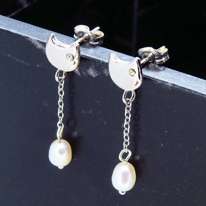 シルバー925 猫フェイスと淡水パールのかわいいスタッドピアス チェーン スワロフスキー 淡水パール ポストピアス