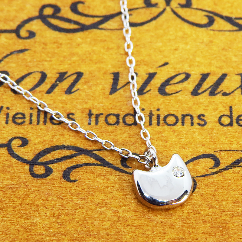 猫フェイスモチーフのシンプルで大人可愛いネックレス シルバー925 スワロフスキー