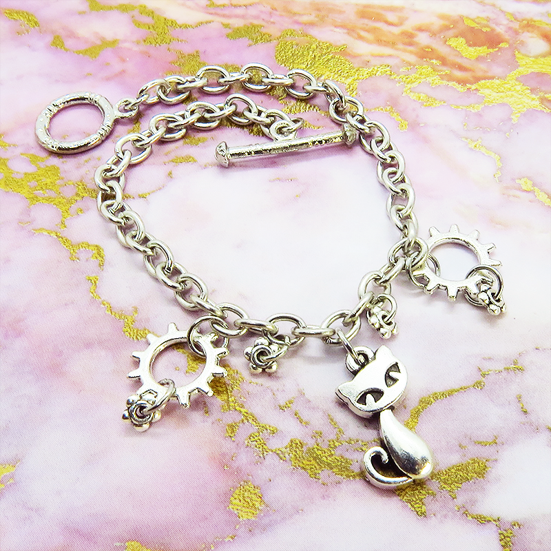 シルバーカラー 猫と歯車を組合わせたスチームパンク風ブレスレット