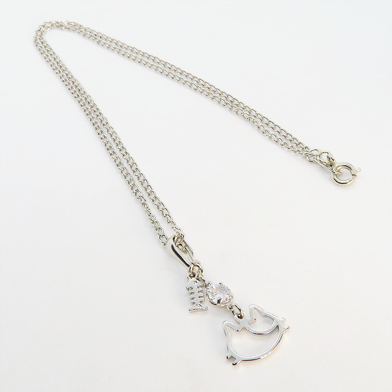 三毛猫の猫フェイスモチーフのフレームと魚のチャームの可愛いネックレス キュービックジルコニア SV925変更可