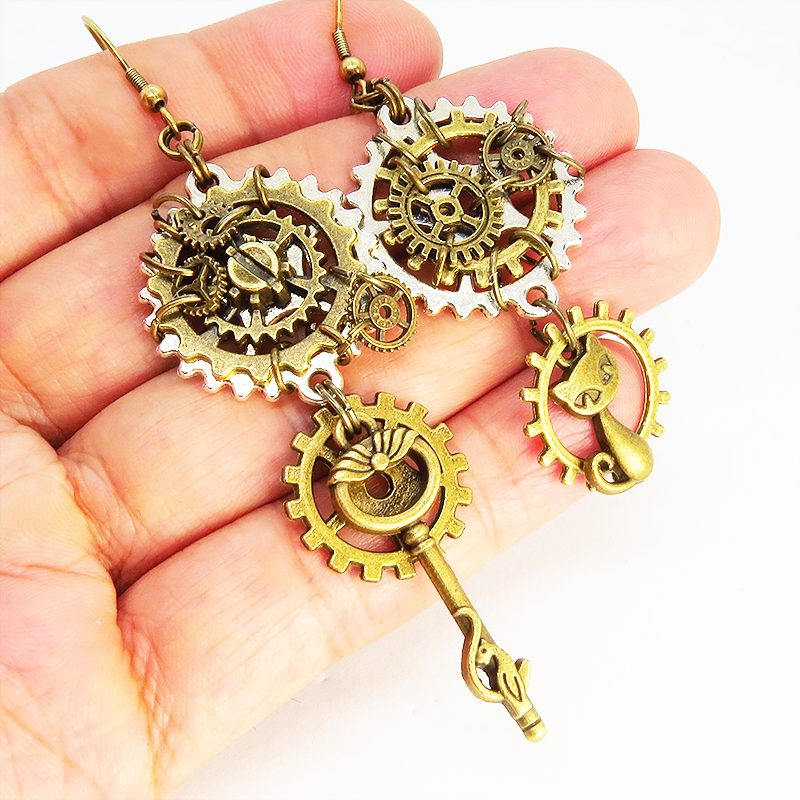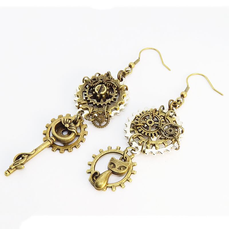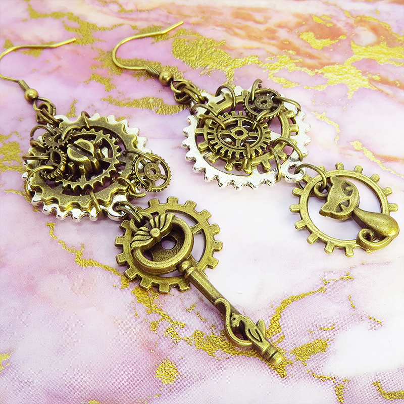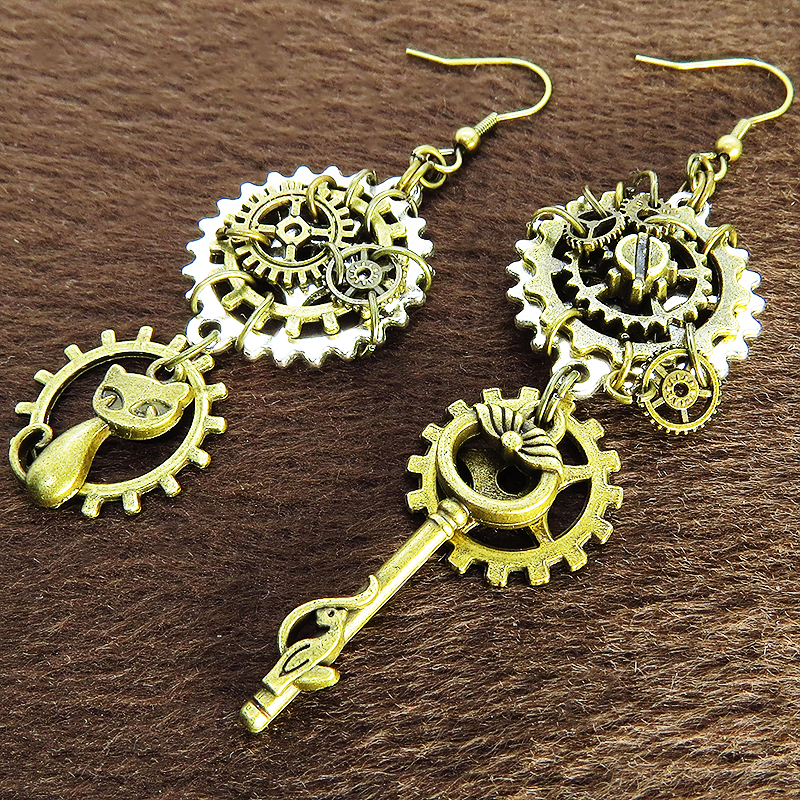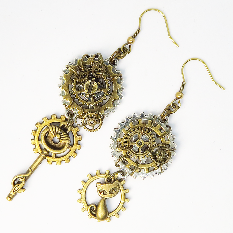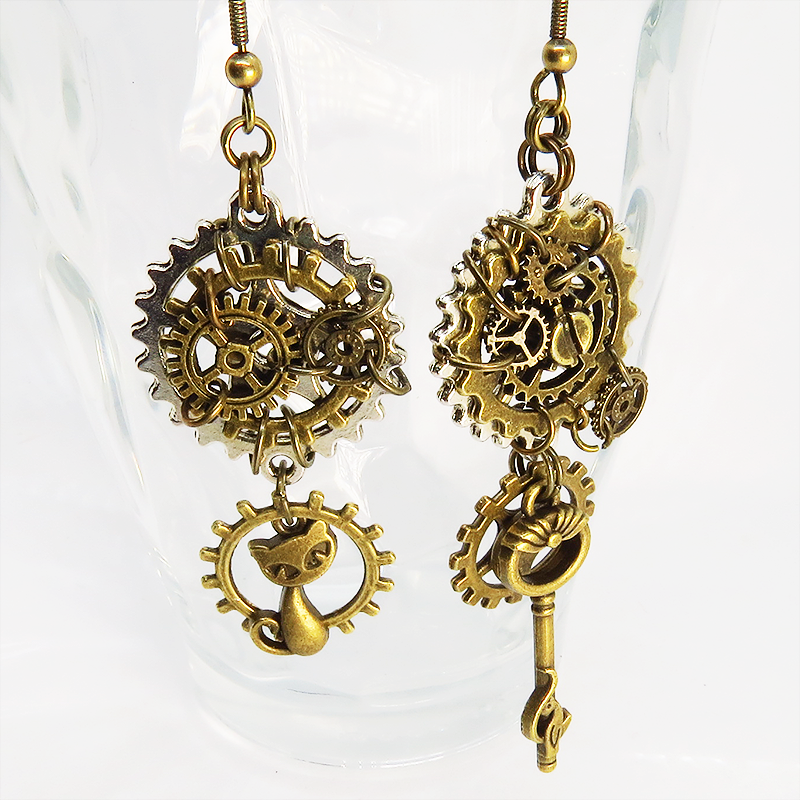 猫と鍵と歯車・ギアのスチームパンク風アシンメトリー ピアス シルバー・アンティークカラー
