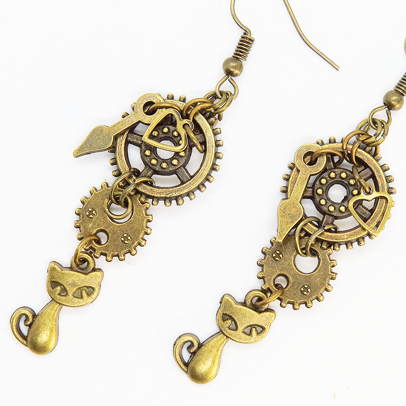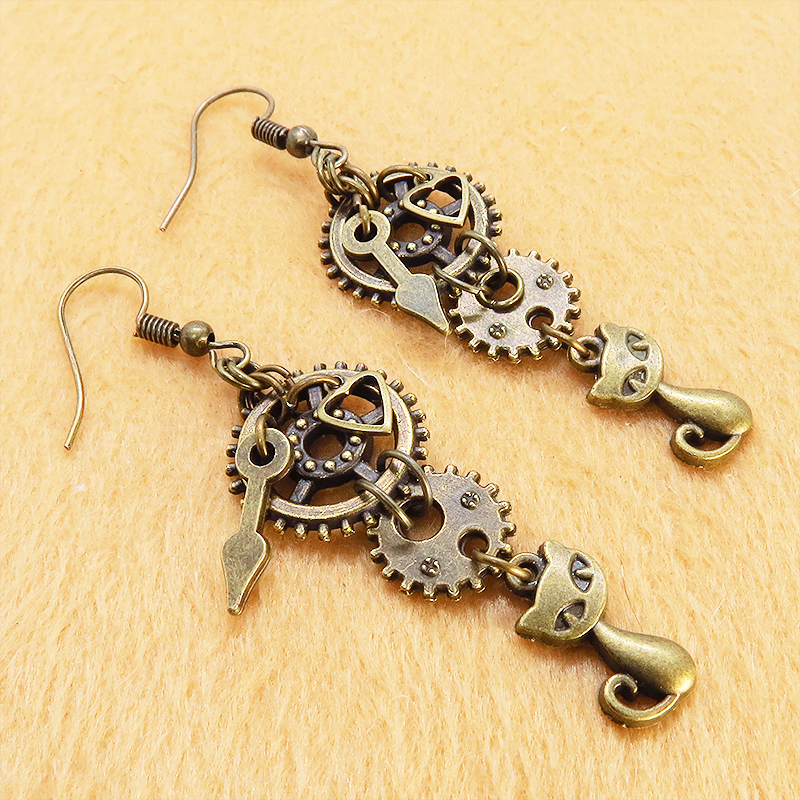 アンティークゴールド(真鍮古美)の猫と歯車のピアス 時計の針 ハート