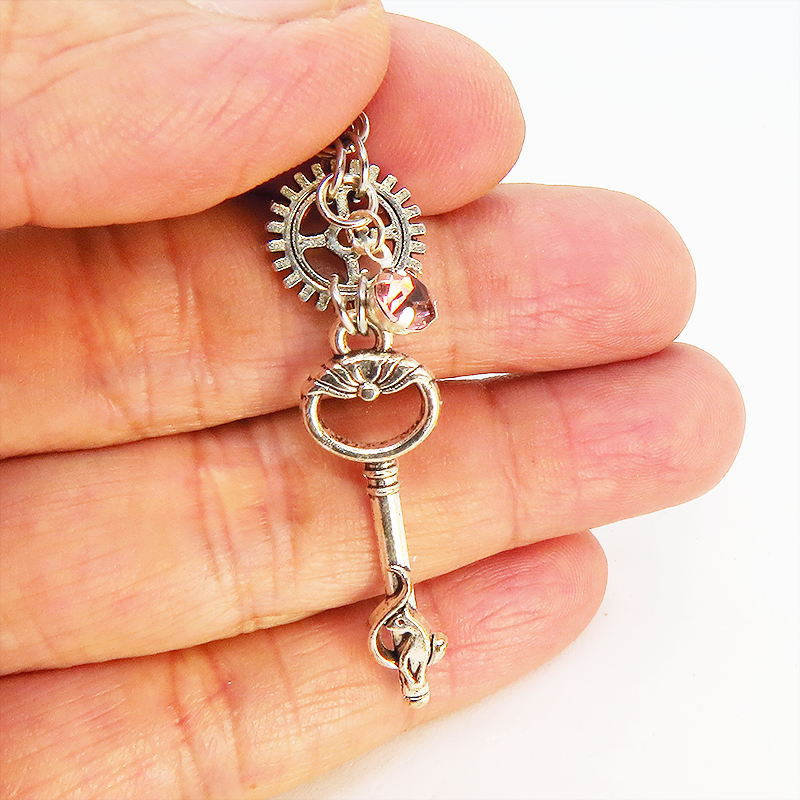アンティークシルバーの鍵に座る猫モチーフと歯車を組み合わせたスチームパン風のピアスです