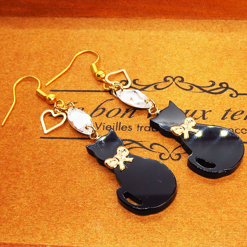 ゴールドカラーのリボンがついた黒猫シルエットモチーフとクリアなスワロフスキーが輝く大人可愛いピアスです