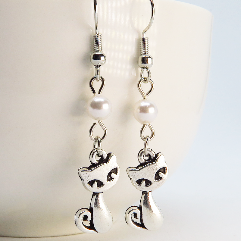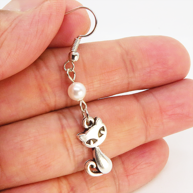 クリスタルホワイト色のパールと同じ輝きのパール加工とマットカラーのように見えるエフェクトを施した、真円形で傷のない仕上がりの美しいスワロフスキーと、落ち着きのあるアンティークシルバーの可愛い猫のモチーフを組み合わせています