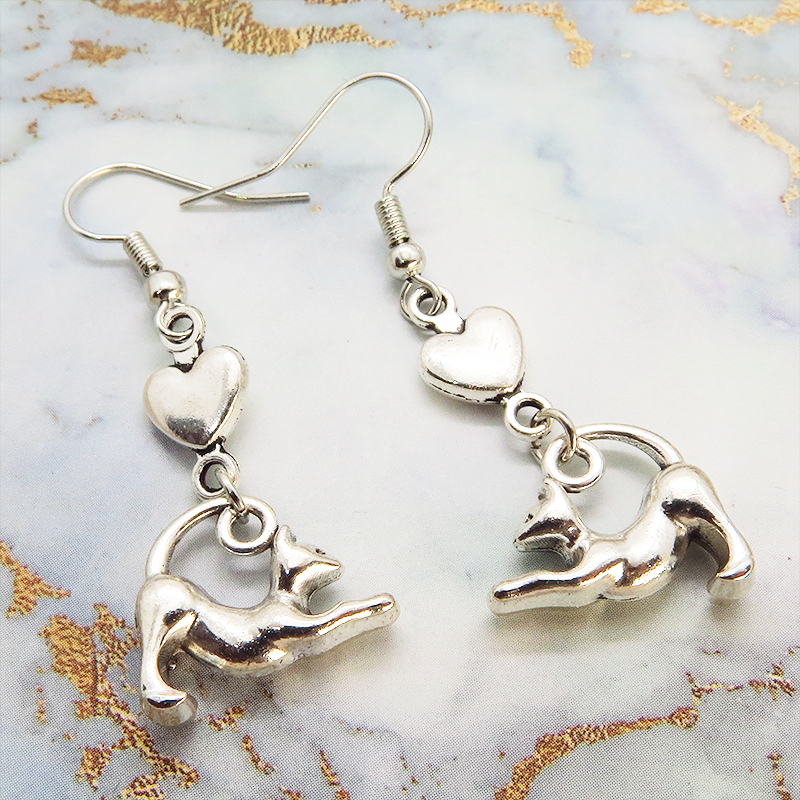 伸びをする猫のシルエットモチーフとハートの組み合わせのピアスです
