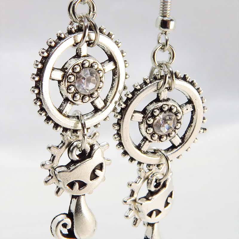 アンティークシルバーカラーで統一した猫と歯車のスチームパンク風シンメトリーピアスです