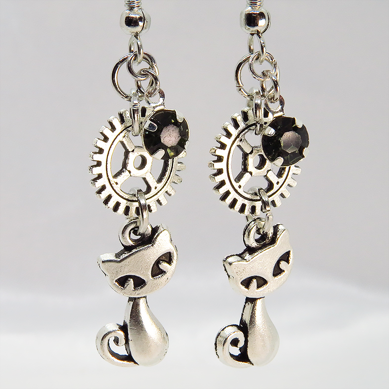 アンティークシルバーの猫と歯車のモチーフを組合せたコンパクトなスチームパンク風ピアスです