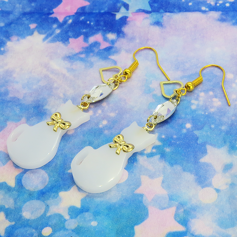 ゴールドカラーのリボンがついた白猫シルエットモチーフとクリアなスワロフスキーが輝く大人可愛いピアスです