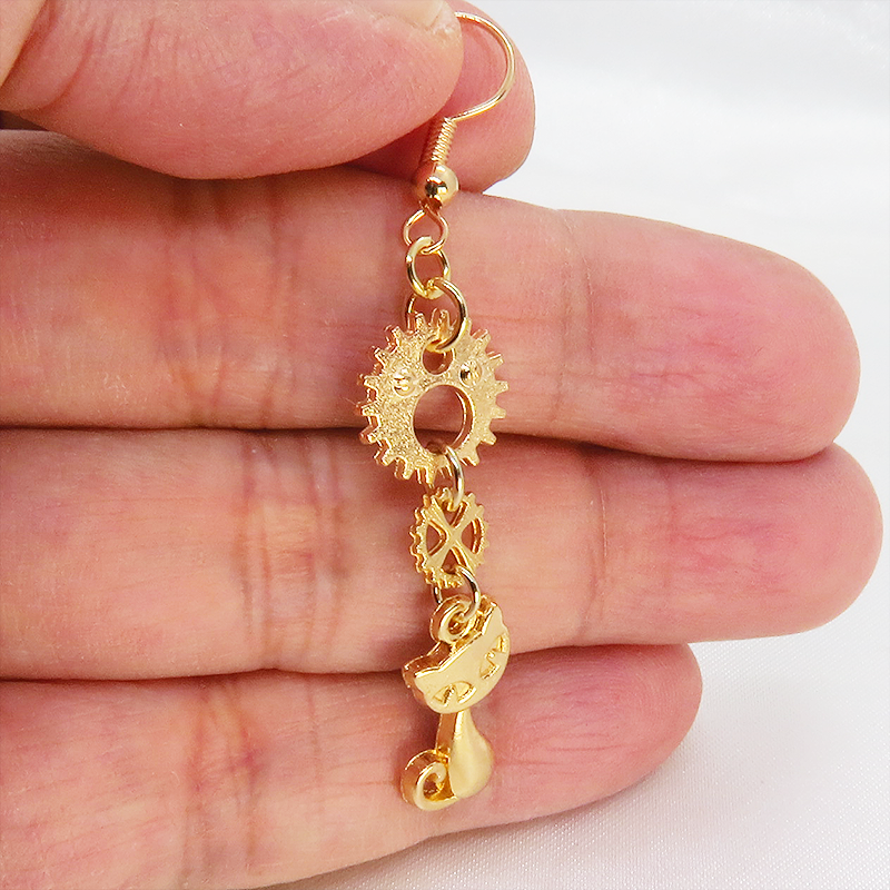 落ち着きのあるマットゴールドで統一した、猫と大小異なる大きさの歯車を組み合わせたピアスです