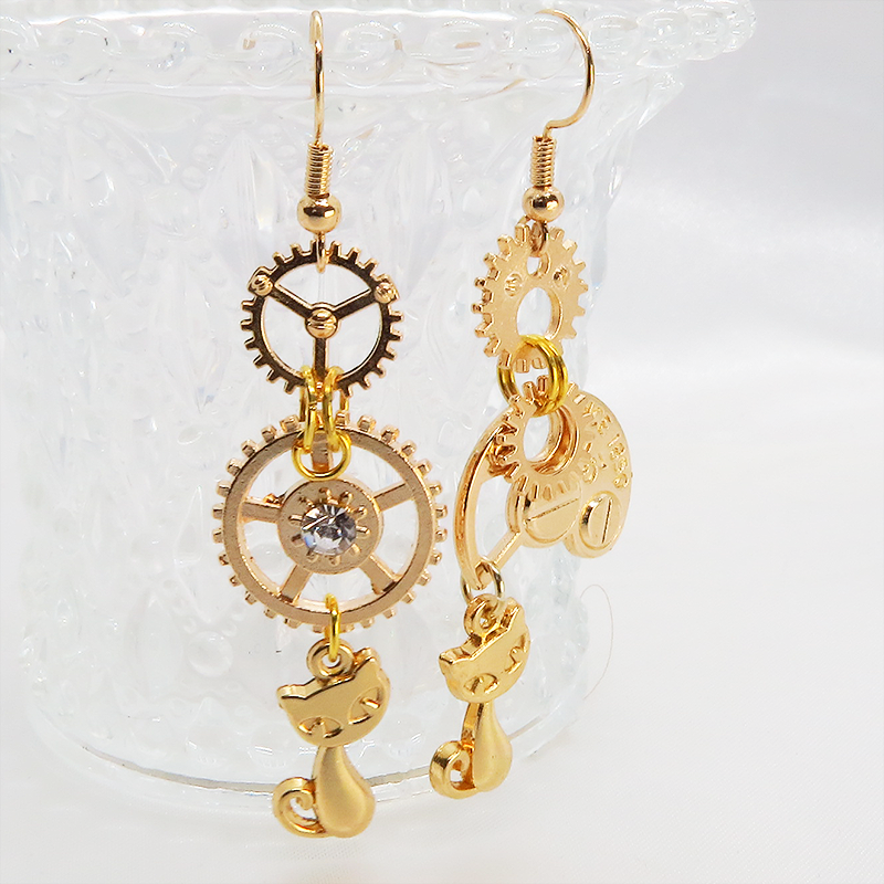 マットゴールド 猫と歯車を組み合わせたスチームパンク風アシンメトリーピアス スワロフスキー サージカル可