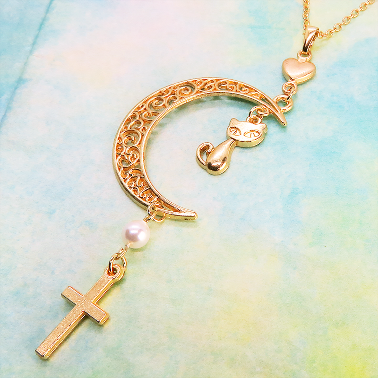 マットゴールド 猫とアラベスク調透かし入りの三日月のネックレス スワロフスキーパール ロザリオ ハート 長さ調整可