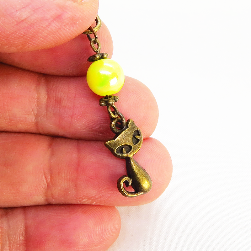 落ち着きのあるアンティークカラーの猫と華やかな色彩のミックスイエローのビーズを組み合わせたファスナーチャームです